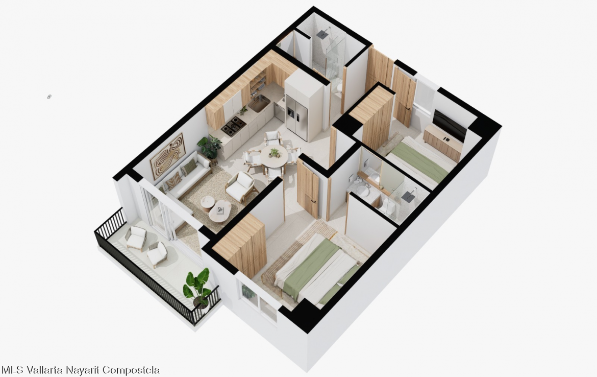 Condo #302 at Alero offers 2 bedrooms and 2 baths, located on the third level on the left side along Honduras Street, just a short walk to the beach. Its spacious, well-planned layout includes a private terrace that enhances indoor-outdoor living and everyday comfort. From this level we can enjoy ocean views of the north side of the bay. Secure it now with pre-construction discounts starting at 12% with multiple payment plan options available. Alero is a boutique development of 26 condominiums across six levels in the 5 de Diciembre area in the heart of downtown, only two blocks from the beach and steps from the Malecon. Amenities include a welcoming lobby, interior garden, and a rooftop with infinity pool, gym, lounge, BBQ area, and 360 views of the bay, city, and mountains.