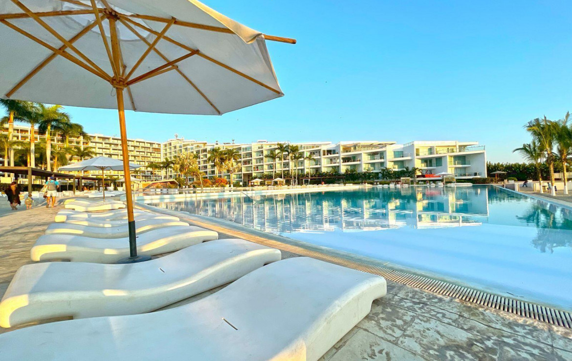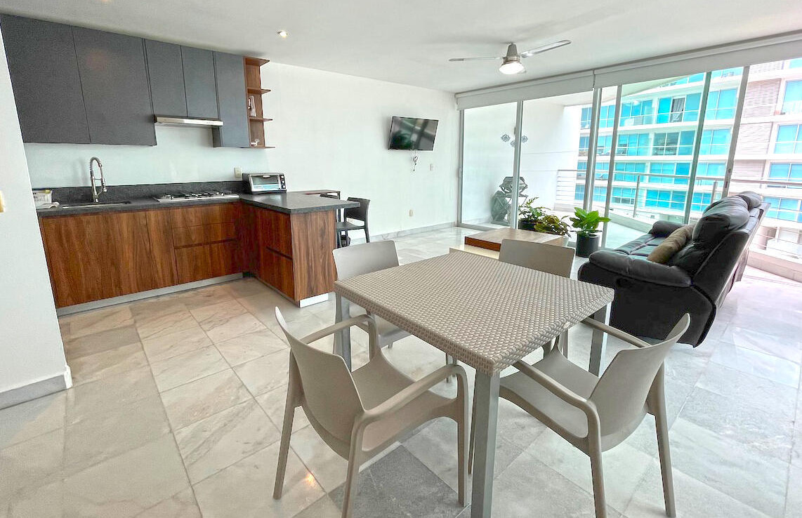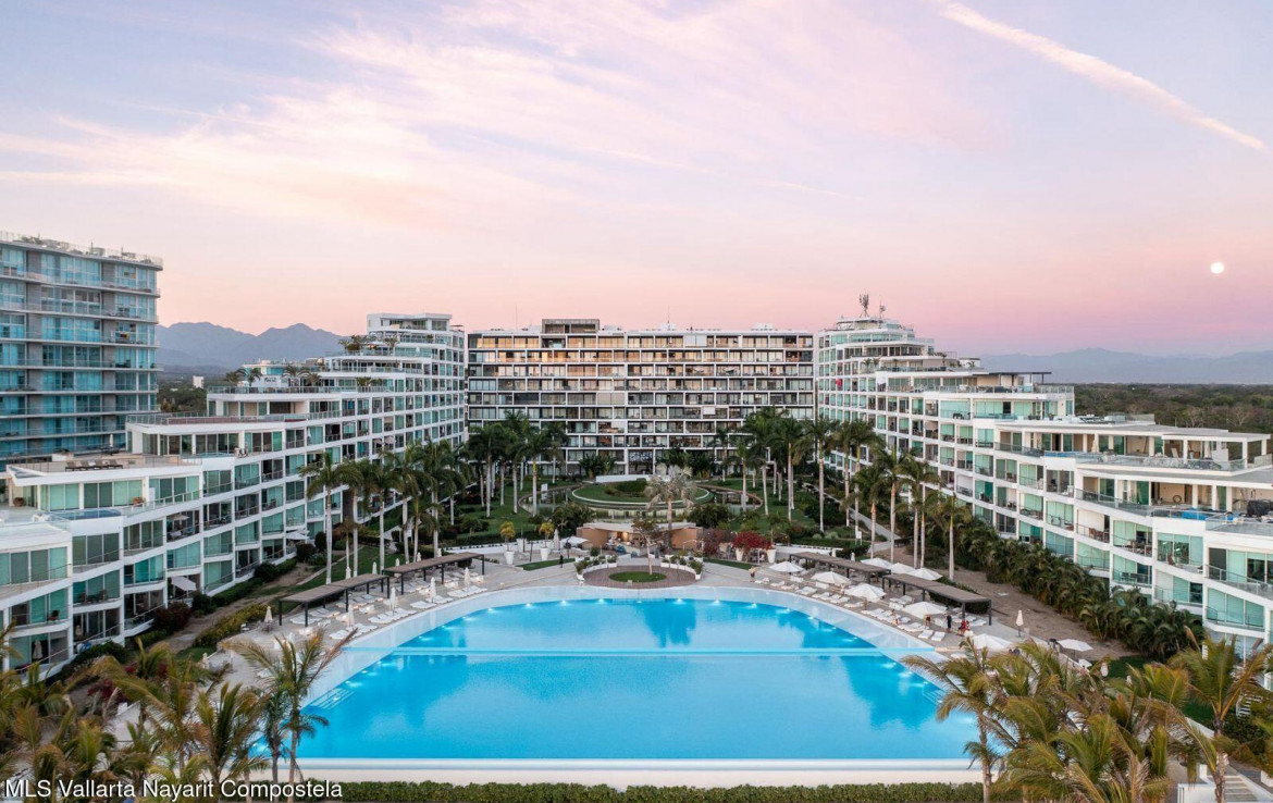 On the pristine beach of Nuevo Vallarta in Bahia de Banderas is this Beautiful beachfront 2 bedroom 2 bath condo, set on the long white sand beaches of Flamingos, Nuevo Vallarta in Condo Aria Ocean. The calm surf invites you to come take a dip in the warm water or simply lounge around one of the two large infinity pools or the smaller pool set right on the sand. The beautiful grounds filled with palm trees, plants, flowers and a large fountain make this a truly calming space. This turnkey condo has been upgraded with a new kitchen and furnishings. Plus the 2 large balconies make for a great outdoor space to rest or have a BBQ.