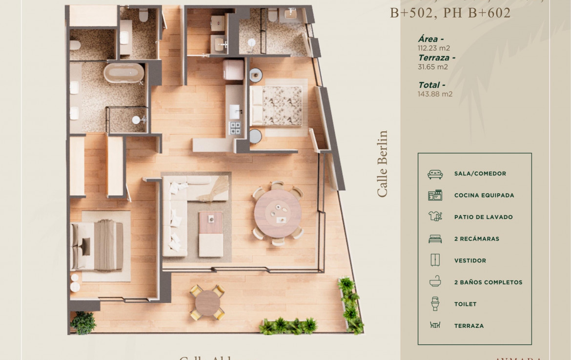 Aymara Versalles se encuentra en el corazon de la Colonia Versalles, en las calles Aldanaca y Berlin, una de las zonas de mas rapido crecimiento de Puerto Vallarta. El complejo cuenta con 43 unidades residenciales y una selecta variedad de practicos locales comerciales, dentro de un concepto moderno que combina un diseno cuidado, funcionalidad y una ubicacion muy conveniente. Las residencias tienen entre 64,55 m2 y 143,88 m2, con distribuciones de 1, 2 y 3 dormitorios disenadas tanto para una vida comoda como para un solido potencial de inversion. El proyecto ofrece acabados de alta calidad, amplias terrazas y acogedoras zonas comunes que complementan el dinamico estilo de