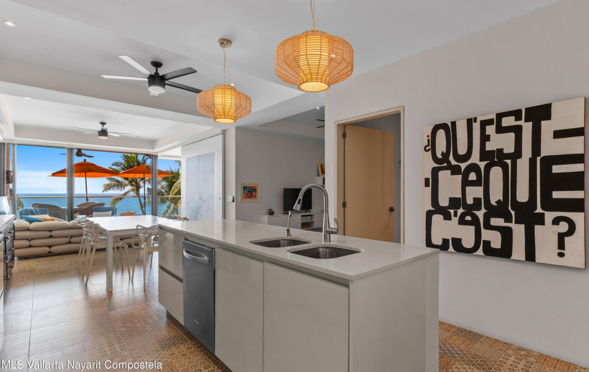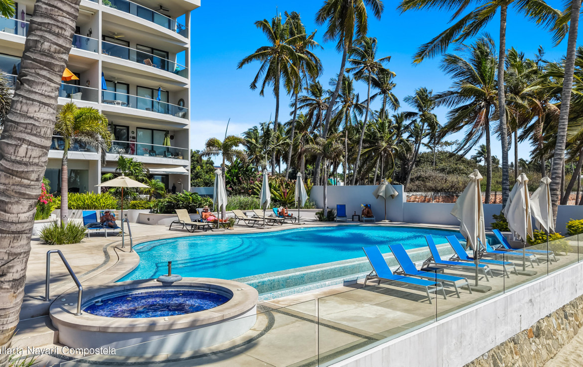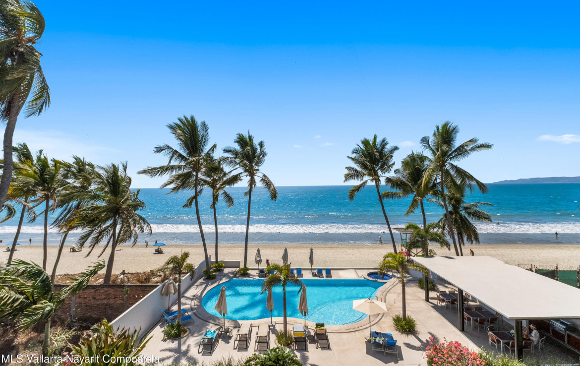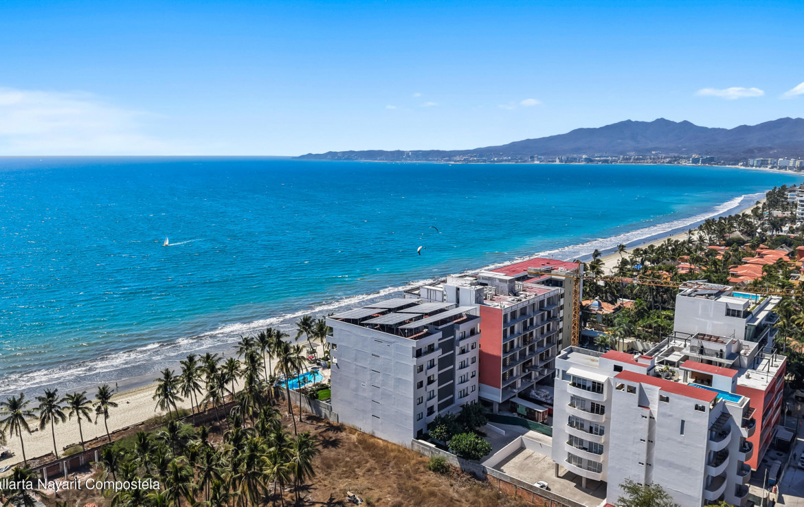 In English below.Bienvenido a una oferta exclusiva en el corazon de la codiciada Zona Dorada de Bucerias. Ubicado en un intimo complejo boutique de solo 16 unidades, esta propiedad frente a la playa ofrece la combinacion perfecta de privacidad, seguridad y una vibrante vida costera. Al salir de tu puerta, te encontraras rodeado de galerias de arte, restaurantes de clase mundial y tiendas boutique.Esta residencia en el tercer nivel es verdaderamente unica, meticulosamente personalizada durante la construccion por una estilista profesional. A diferencia de las unidades estandar, este hogar presume acabados de disenador y detalles arquitectonicos exclusivos que