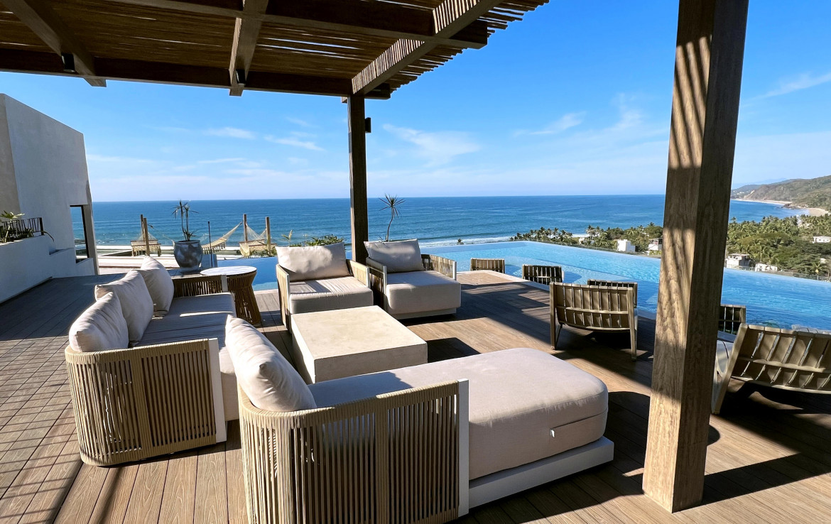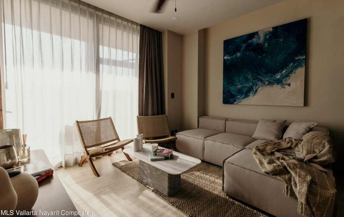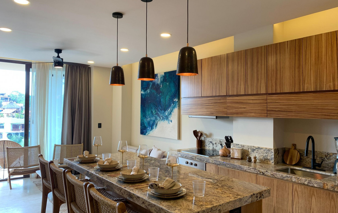 Unit 213 is a chic 2-bedroom, 2-bathroom oasis tucked into the treetops above Sayulita. It features an open-concept Italian-style kitchen with stone countertops, living and dining area that flow onto a private terrace. The master suite includes a king bed and en-suite bathroom, while the second bedroom comfortably accommodates guests. With premium finishes, hardwood accents and smart lighting, the unit seamlessly blends indoor comfort with outdoor tranquility. Residents also enjoy access to shared amenities like a rooftop infinity pool and bar/lounge, fitness center, family pool, hammock lounge, surfboard storage, co-working space, and concierge services.