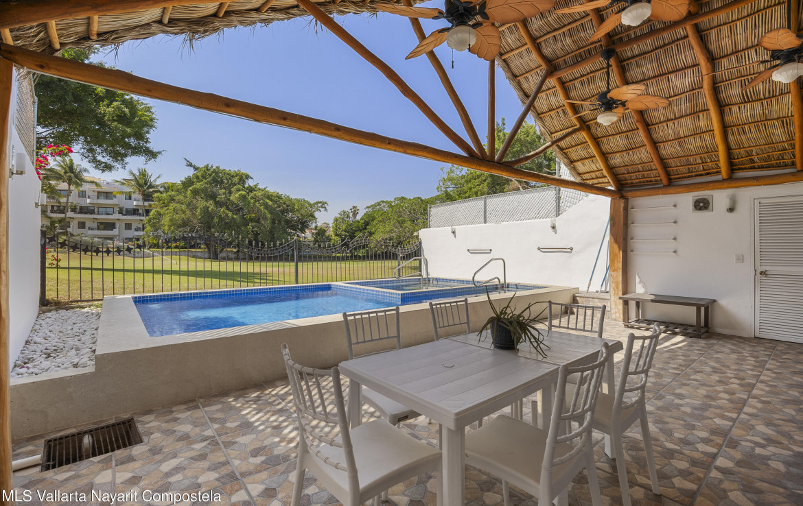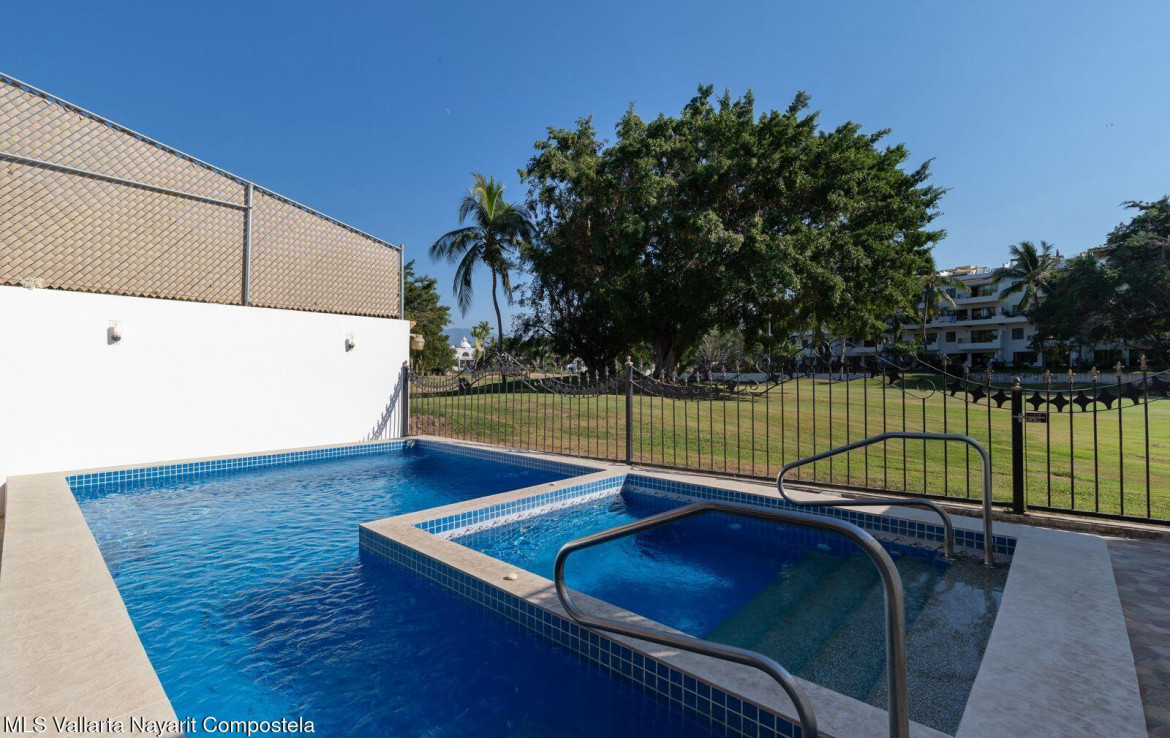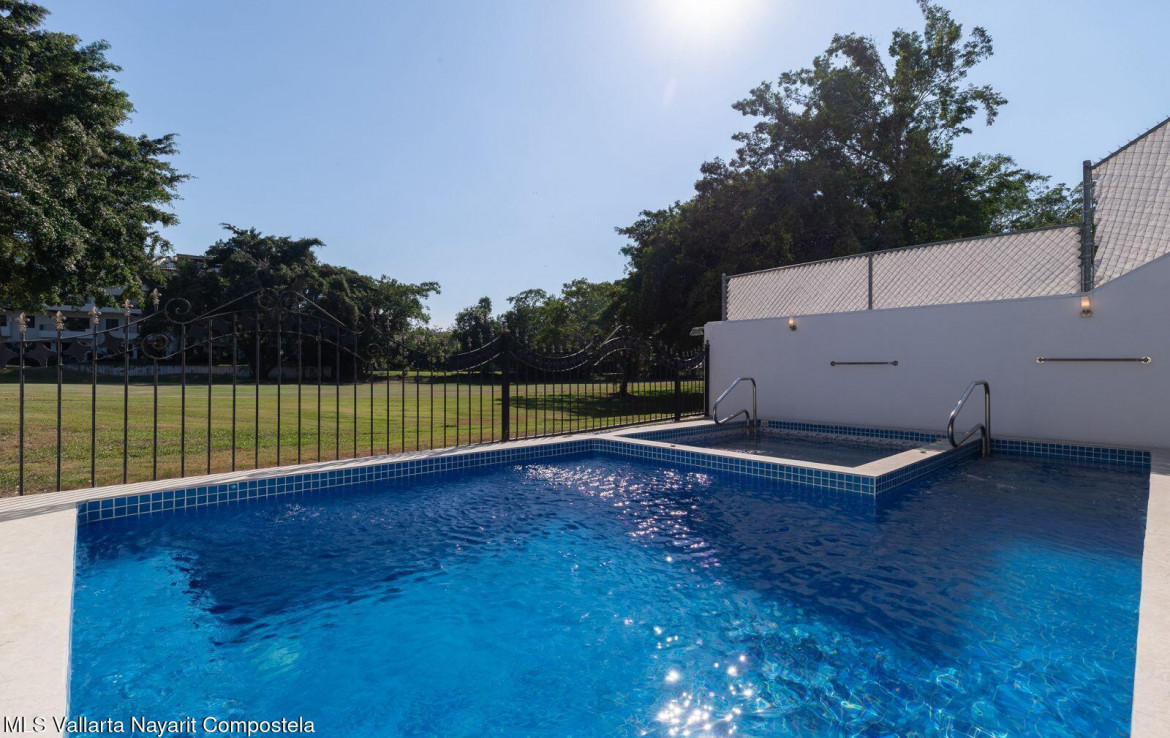 Hermosa casa frente al campo de golf con alberca climatizada y area para entretenimiento. Casa Alma se encuentra en Marina Vallarta. Esta residencia privada frente al campo de golf ofrece 5rec/5ba completos, 2 medios ba, cuarto de servicio y paneles solares. La alberca privada climatizada tiene vista al campo de golf de Marina Vallarta, y la casa cuenta con mas de 400 m2 de construccion. Tiene cochera techada para 2 autos y un amplio espacio junto a la alberca, ideal para reuniones con familia y amigos. La casa esta a poca distancia caminando de los mejores restaurantes, cafes, bares, el malecon de la Marina y, por supuesto, la playa. Se encuentra a solo 5 minutos caminando del aeropuerto y a 15 minutos en coche del Malecon del centro. —