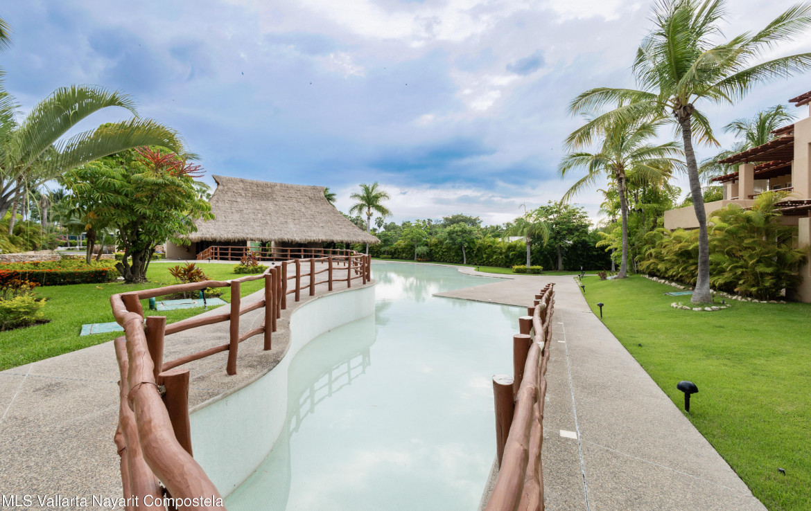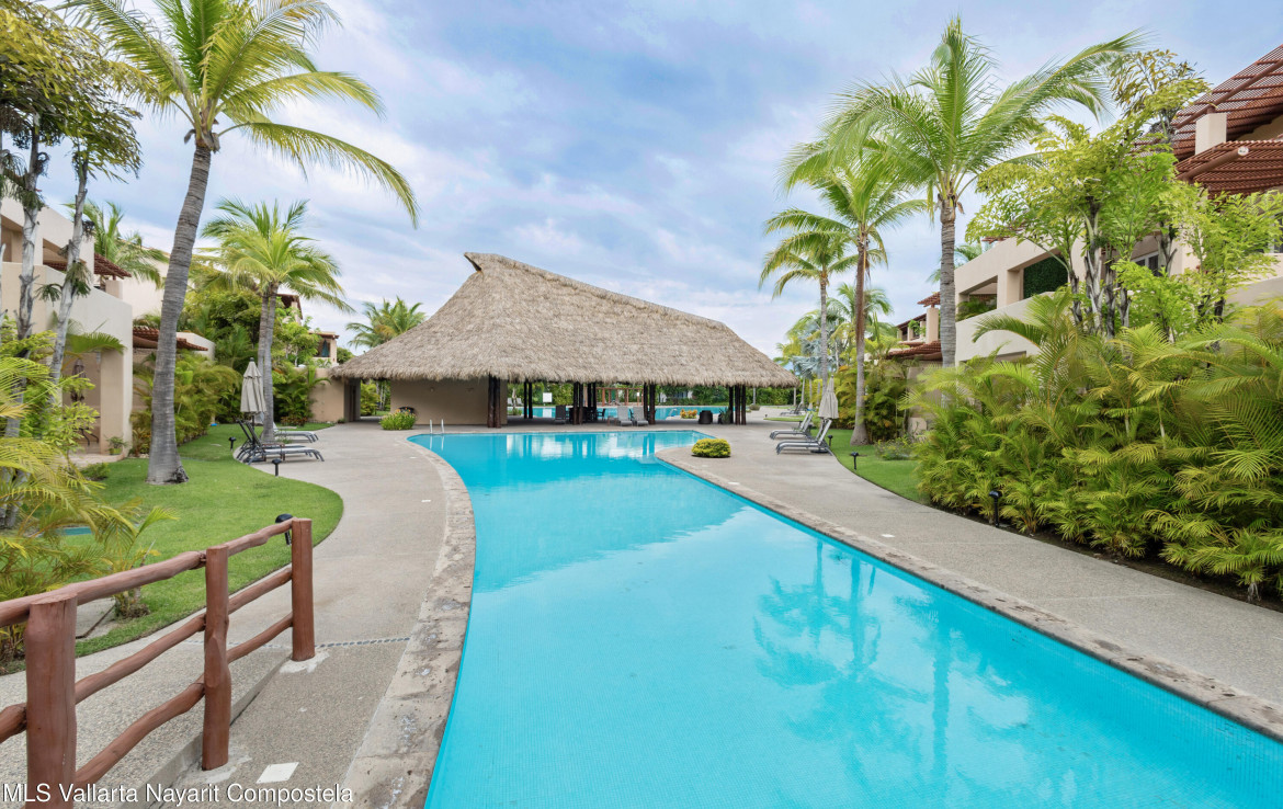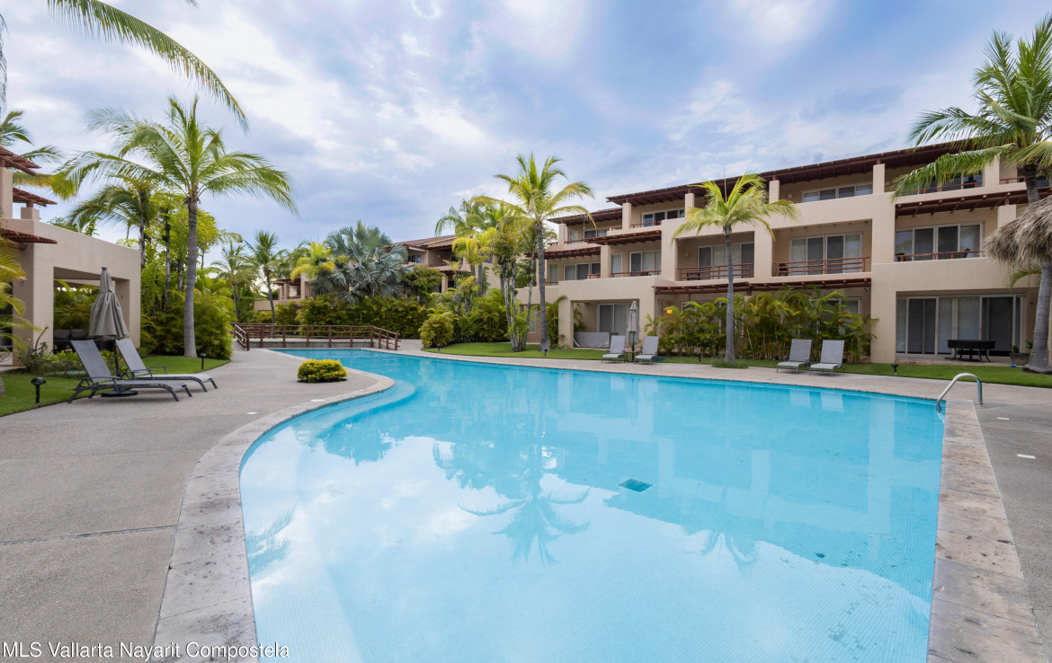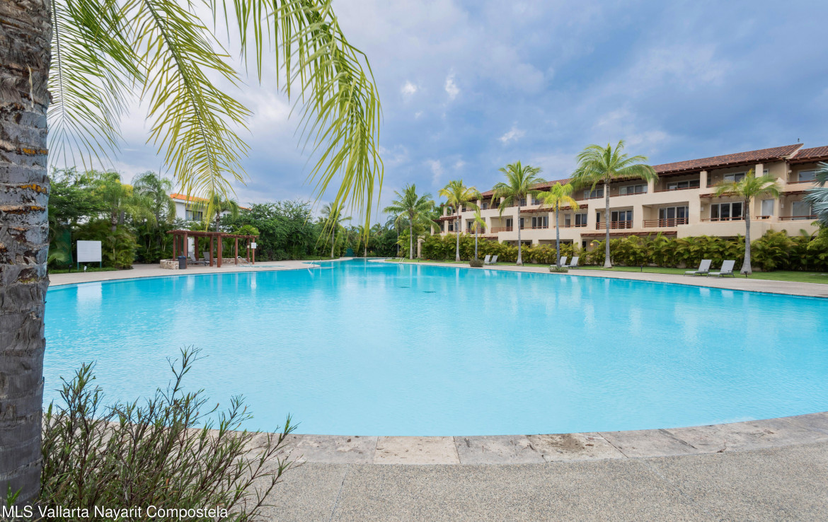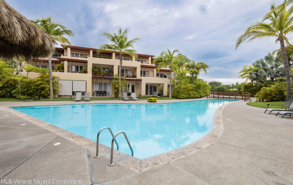 ENGLISH BELOW — Vive el lujo en Isla Palmares, dentro de la exclusiva comunidad El Tigre. Este elegante condominio en planta baja ofrece acceso directo a la alberca desde dos amplias terrazas, pisos de marmol y un diseno abierto y luminoso. Disfruta de un ambiente tranquilo, rodeado de jardines y areas verdes. Incluye estacionamiento y bodega escriturados, ademas de acceso al club deportivo, campo de golf y seguridad 24 horas de El Tigre. Lujo, confort y serenidad en un solo lugar.