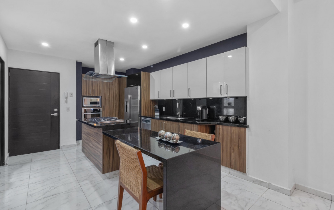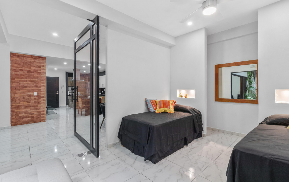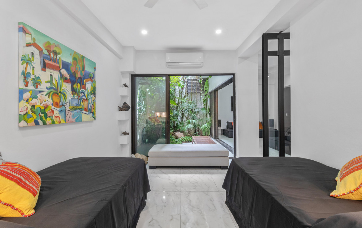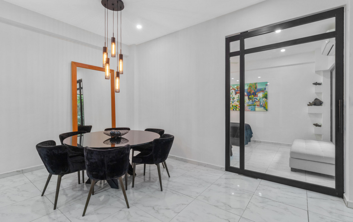 Welcome to Condo Aguacate, a stunning duplex with two seamlessly connected one-bedroom units. Independent entrances on both floors offer convenience and versatility. Each spacious level is fully self-contained with bedroom, bathroom, living room, dining area and kitchen. The ground floor is currently used as an entertainment space with a guest room and laundry facilities, while the second floor serves as the owner’s suite, featuring a landscaped front balcony and a bedroom to the rear with a Juliet balcony overlooking the lush, enclosed patio below. A lock-off door allows for complete separation between levels for both privacy and potential rental income. Located on a quiet, flat street, this property offers elegance and modern design at a great value for the neighborhood.