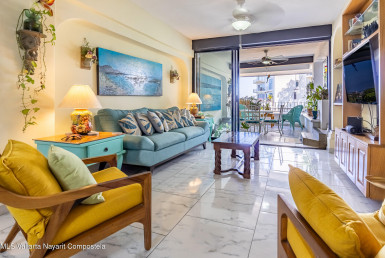 Disfrute de las vistas al mar de Playa Los Muertos. Condominio amueblado de 4 niveles ubicado en el prestigioso Amapas Inferior. Cuenta con 2 recamaras con banos en suite y terrazas llenas de plantas, palapa y alberca en la azotea, 2 banos para invitados, cochera, paneles solares, camaras de seguridad, estacionamiento. Camine hasta la playa en 5 minutos.Enjoy oceanviews of Playa Los Muertos. Furnished 4 level condo located in prestigious Lower Amapas features 2 bedrooms with ensuite baths and terraces full of plants, rooftop palapa and pool, 2 guest baths, garage, solar panels, security cameras, guest parking. Walk down to the beach in 5 minutes.