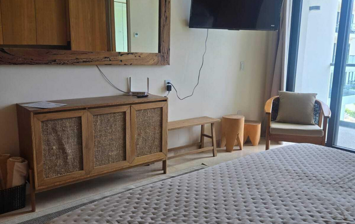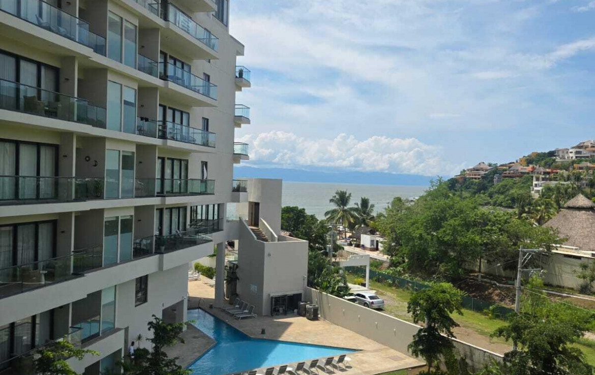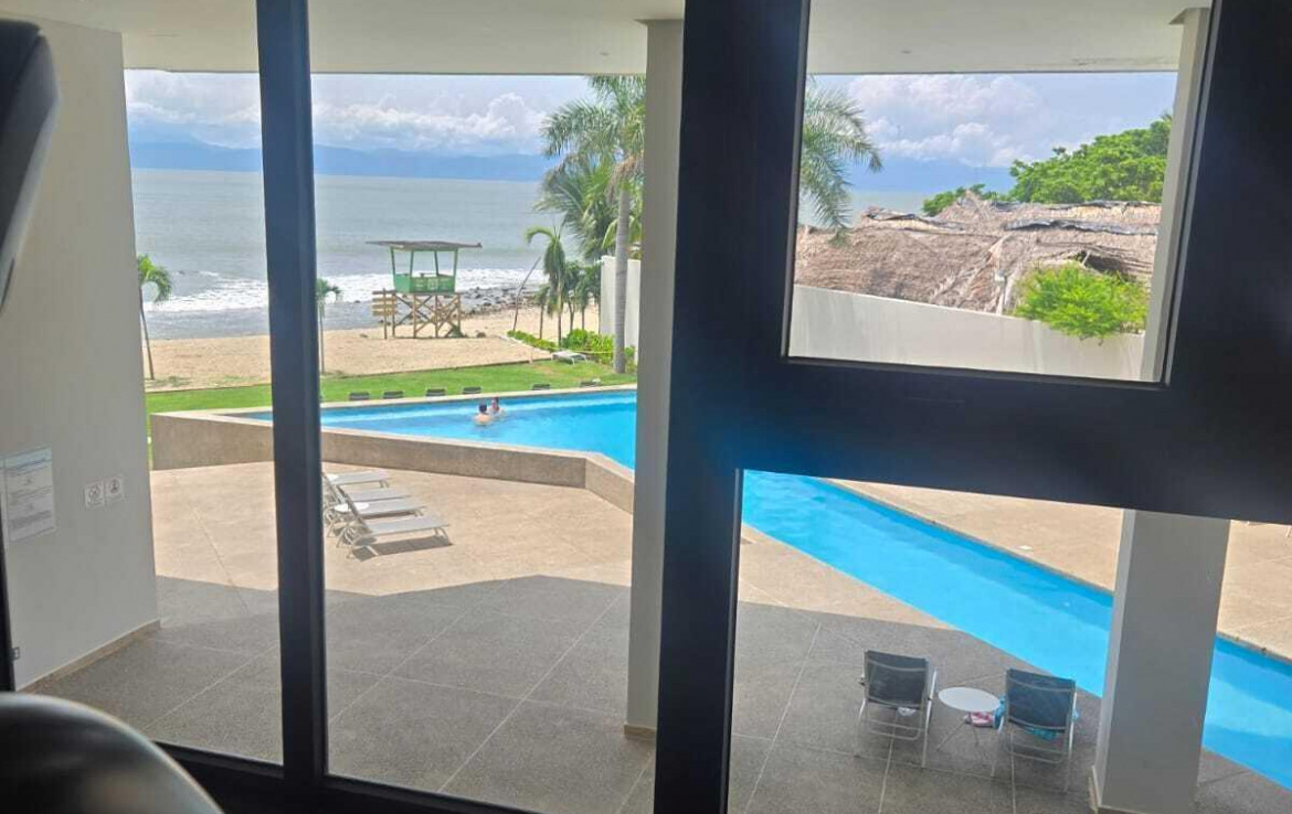 Excelente ubicacion de departamento. Goce una vista al mar desde su balcon. El departamento cuenta con una cama king size ademas de una litera con camas individuales, por lo que comodamente se pueden hospedar 4 personas. Cuenta con cocineta equipada, esta amueblado y tiene 2 banos completos. En el desarrollo disfurte de sus albercas, gym, ludoteca, areas verdes entre otras amenidades. Departamento frente al mar para caminatas en la playa, rentas vacacionales y dias de descanso.