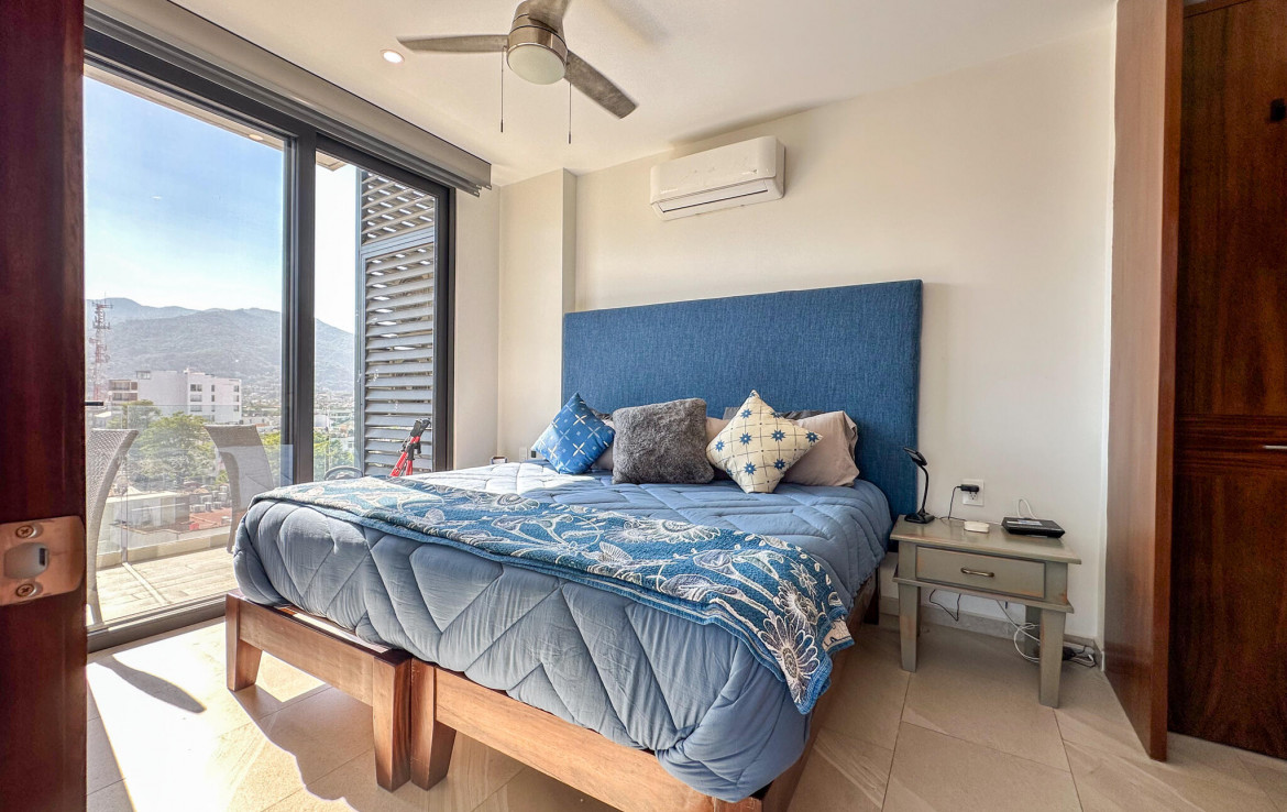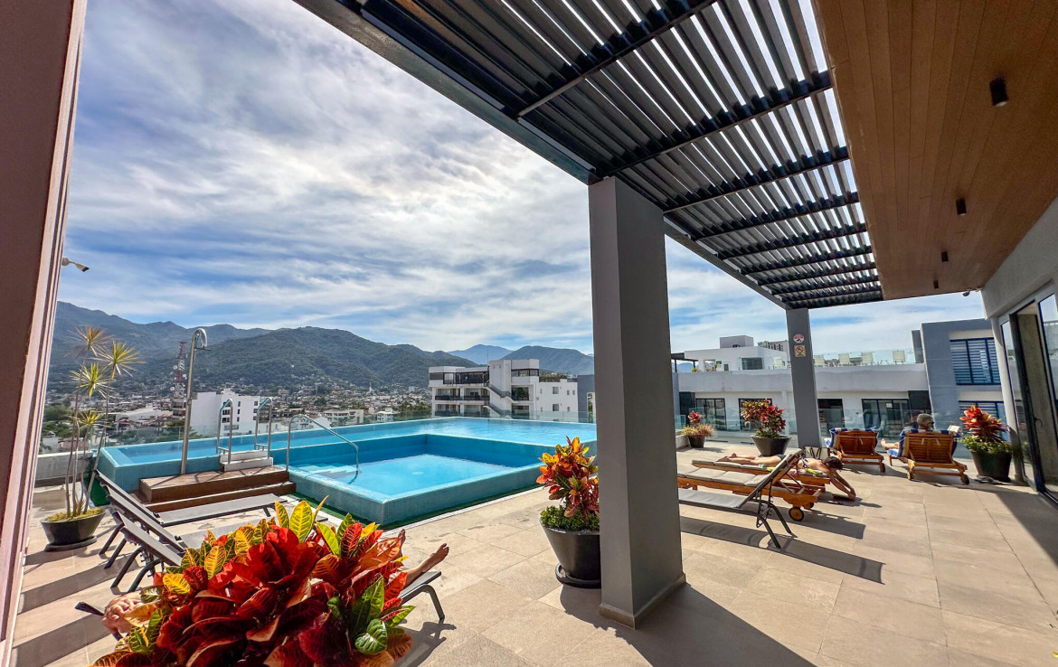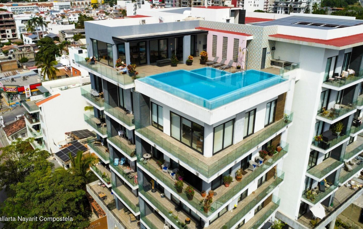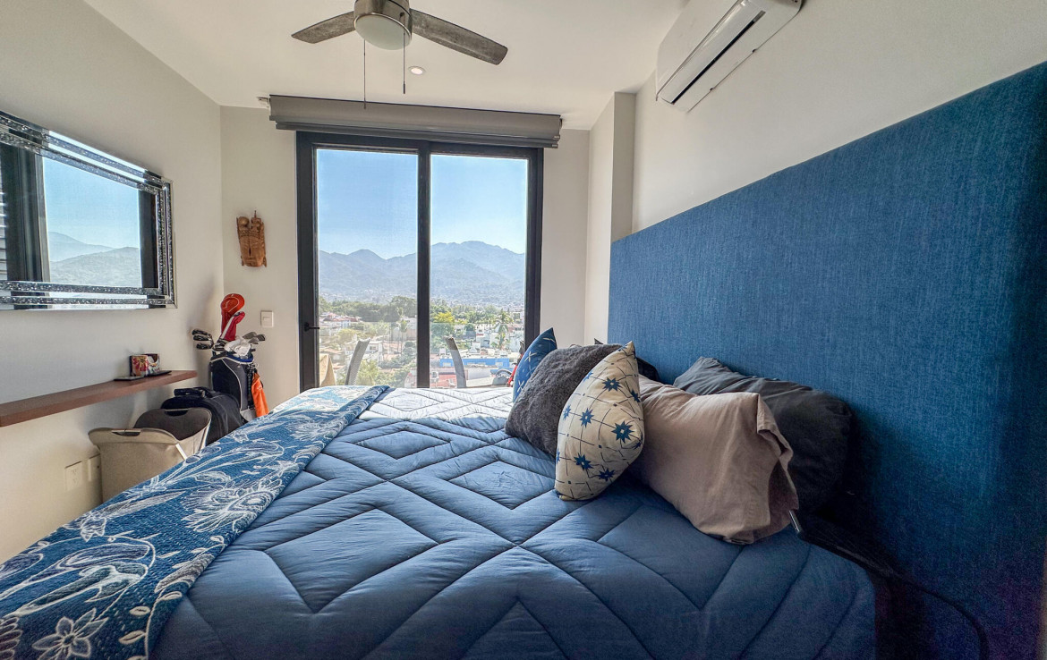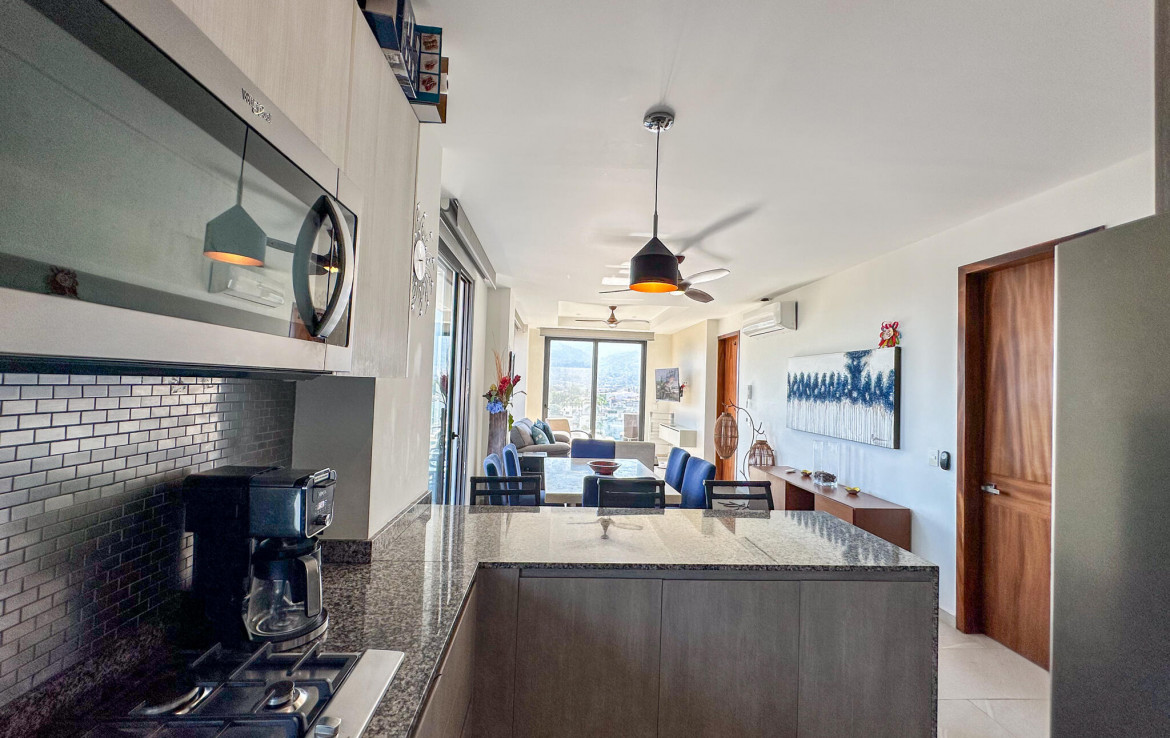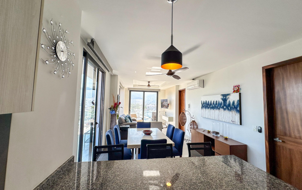 Descubre la mezcla perfecta entre lujo moderno y vida urbana en Punto Madeira, justo en el corazon de la Versalles, la colonia favorita de Puerto Vallarta. Este depa es puro estilo y luz; los espacios abiertos se iluminan increible gracias a sus enormes ventanales de piso a techo. Como puedes ver en las fotos, estas ventanas enmarcan unas vistas brutales de la Sierra Madre y la ciudad, creando el fondo perfecto para tu dia a dia. La vibra entre la sala y el comedor es super comoda, ideal tanto para relajarte en el sofa como para armar una cena con amigos, todo conectado a una cocina moderna que no solo se ve genial, sino que es super funcional.
