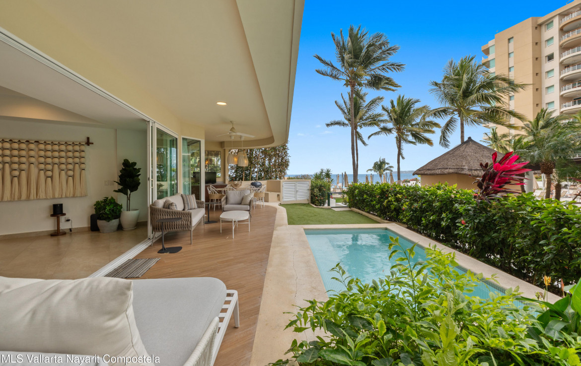 Sin lugar a dudas uno de los mejores Departamentos en Delcanto. Amuebaldo / decorado (sujeto a ofertas a precio lleno) listo para disfrutar la vista al mar desde la terraza. 4 recamaras con 4 banos completos. La cocina se remodelo recientemente. La calidad de muebles y decoracion hacen de esta opcion una joya. Ademas cuenta con alberca climatizada (frio y calor) en el departamento para disfrutar todo el ano. Desde la terraza disfrute atardeceres y salga directo del departamento hacia la playa ubicada a pocos pasos.EN TOTAL 295.82 M2 ENTRE DEPARTAMENTO, TERRAZA Y JARDIN