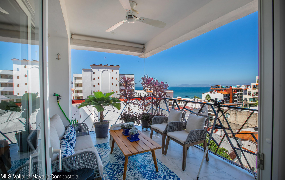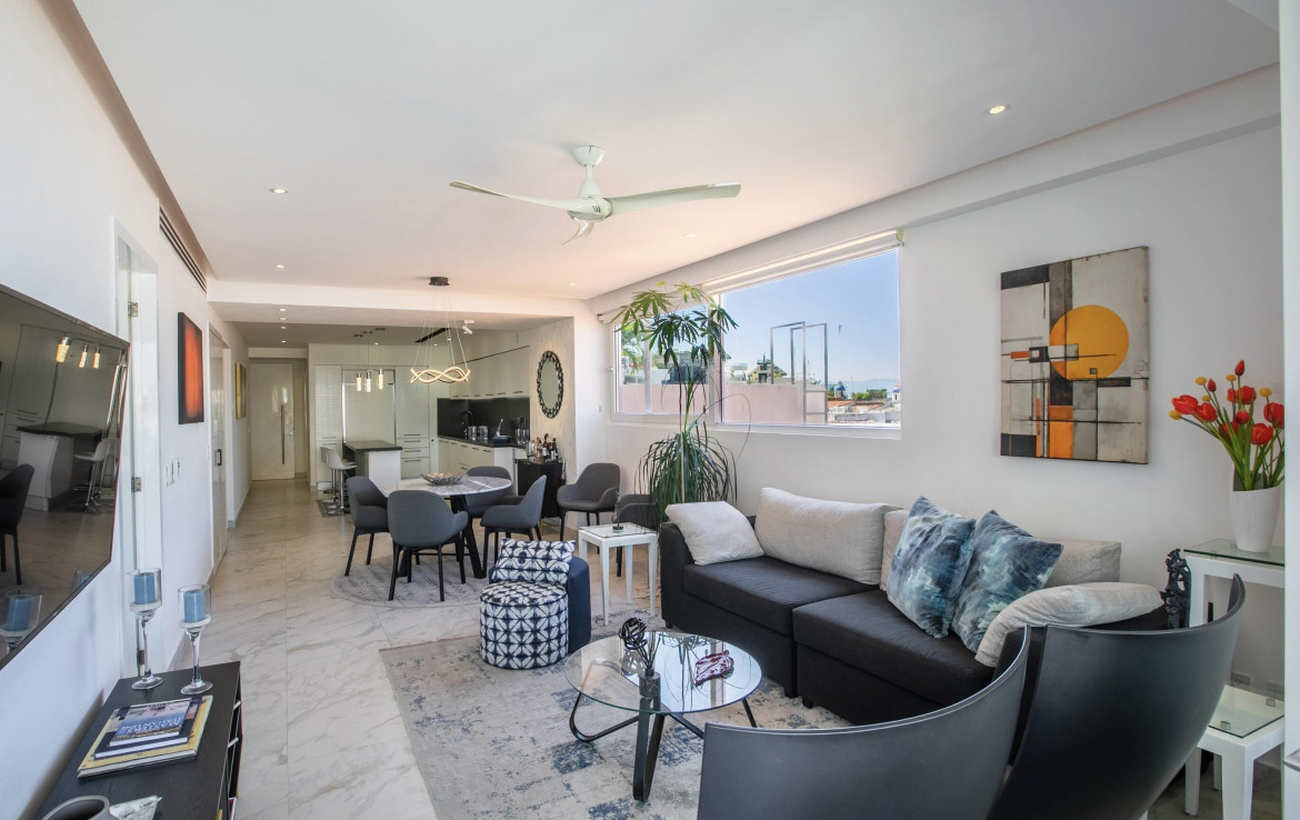 Increible departamento en esquina localizado en el lujoso condominio D Terrace, localizado en el mejor lugar de la zona romantica perfectamente ubicado suficientemente lejos y cerca de absolutamente todo y en una fantastica calle privada. Este condominio completamente equipado con upgrades tales como mobiliario y accesorios espanoles en los banos, cocina con paneles, muebles de disenador y un largo etcetera, cuenta con dos recamaras, dos banos, una lavanderia con amplio espacio, Jacuzzi, vistas increibles al mar y a la ciudad y esta es de las muy pocas unidades en el condominio que cuenta con una ventana lateral que le brinda mucha luz natural. Esta unidad cuenta con estacionamiento escriturado y bodega escriturada tambien.
