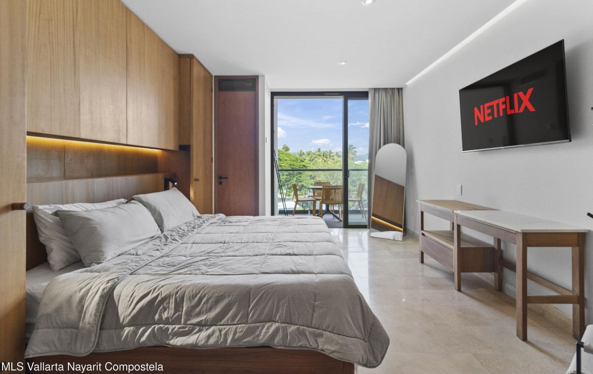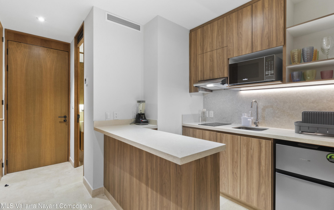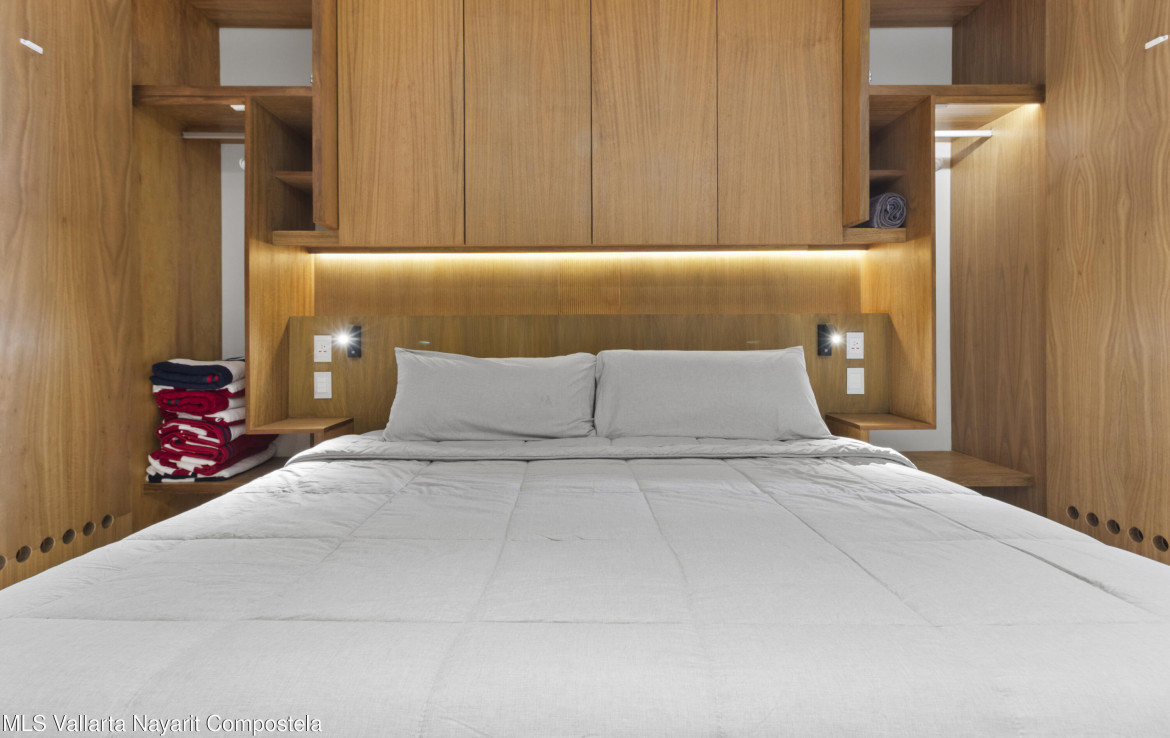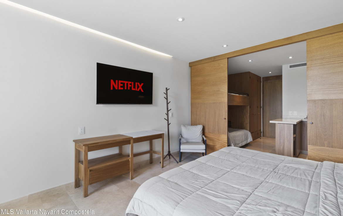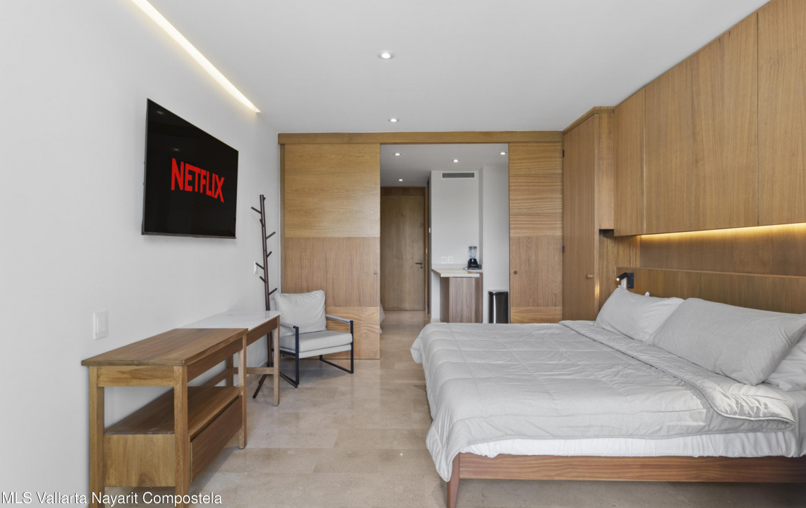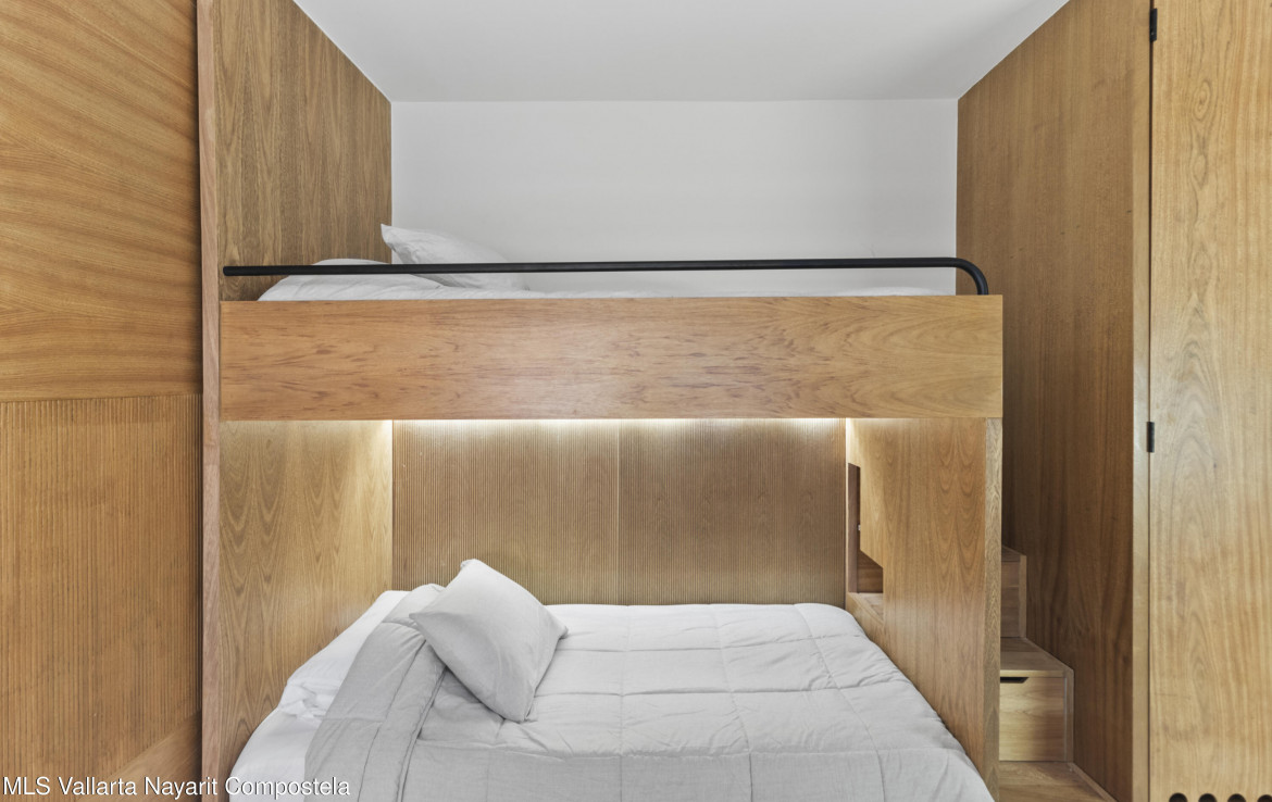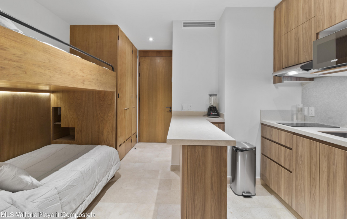 El departamento cuenta con una cama king size ademas de una litera con camas individuales, por lo que comodamente se pueden hospedar 4 personas. Cuenta con cocineta equipada, esta amueblado y tiene 2 banos completos. En el desarrollo disfurte de sus albercas, gym, ludoteca, areas verdes entre otras amenidades. Departamento frente al mar para caminatas en la playa, rentas vacacionales y dias de descanso.