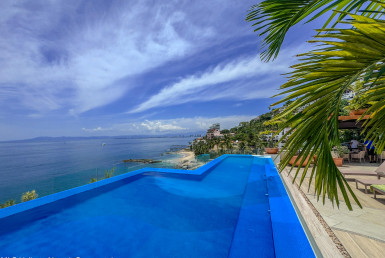Introducing Indah 10D, an exquisite corner residence offering elegant living space, set within one of Puerto Vallarta’s most distinguished addresses. Situated in the exclusive enclave of Conchas Chinas, this three-bedroom, three-bathroom condominium epitomizes modern coastal sophistication with panoramic views over the entire Bahia de Banderas.Upon entering, one is immediately captivated by sweeping ocean vistas, framed by expansive floor to ceiling glass doors and complemented by thoughtfully curated interiors and custom furnishings. The entire south-west corner of the home vanishes with the sliding doors opening entirely to the vistas. Each bedroom features a high-end, spa-feel, en-suite bathroom, enhancing providing both luxury and privacy.