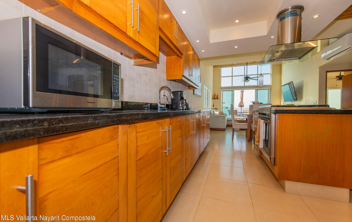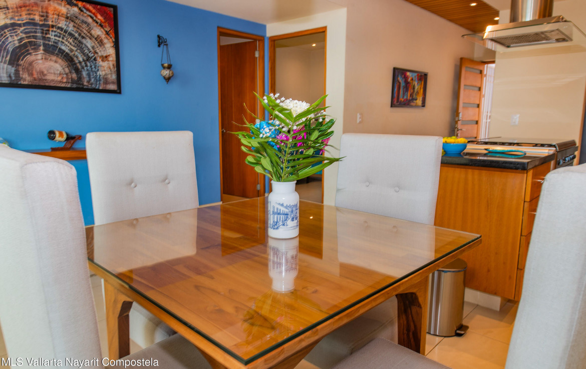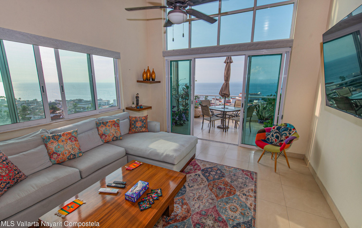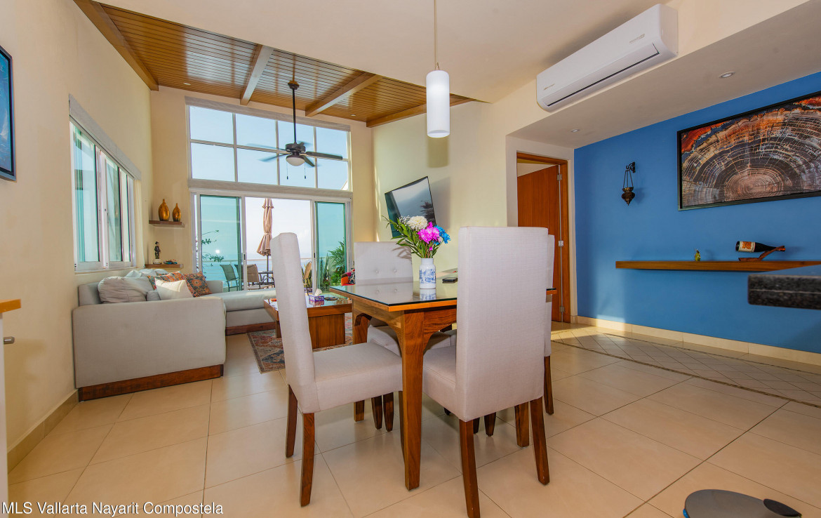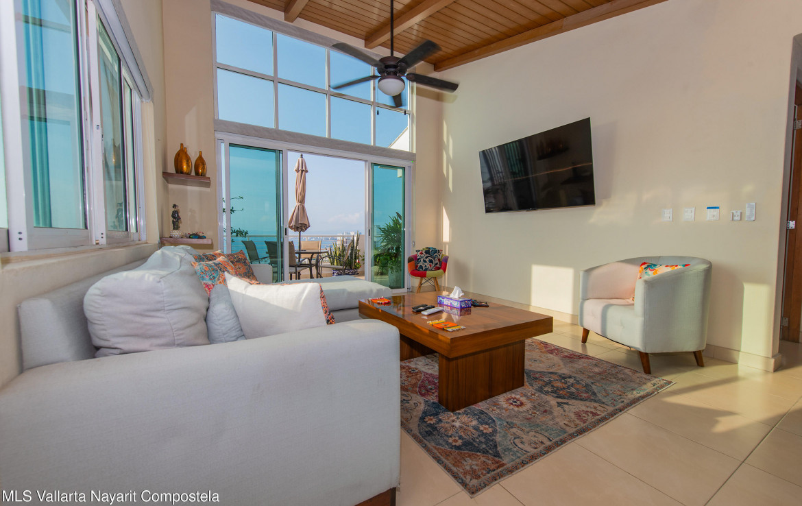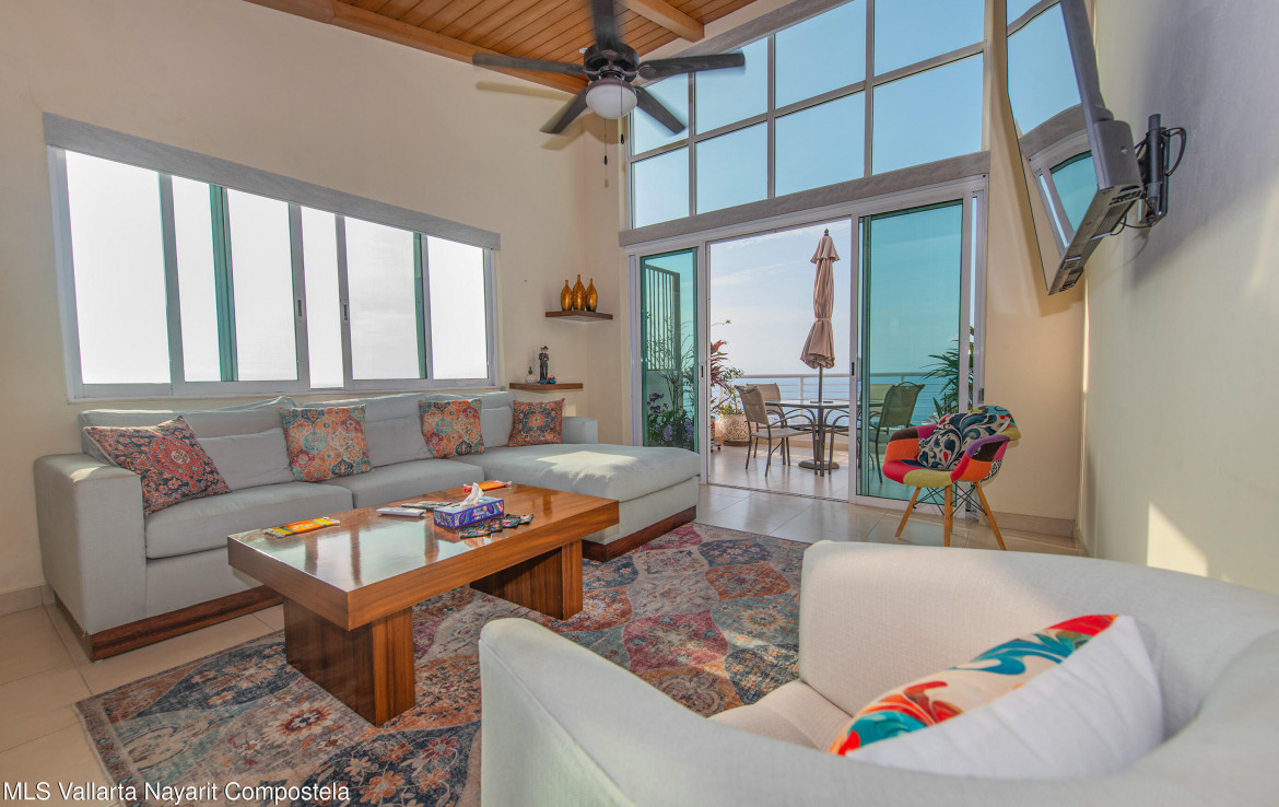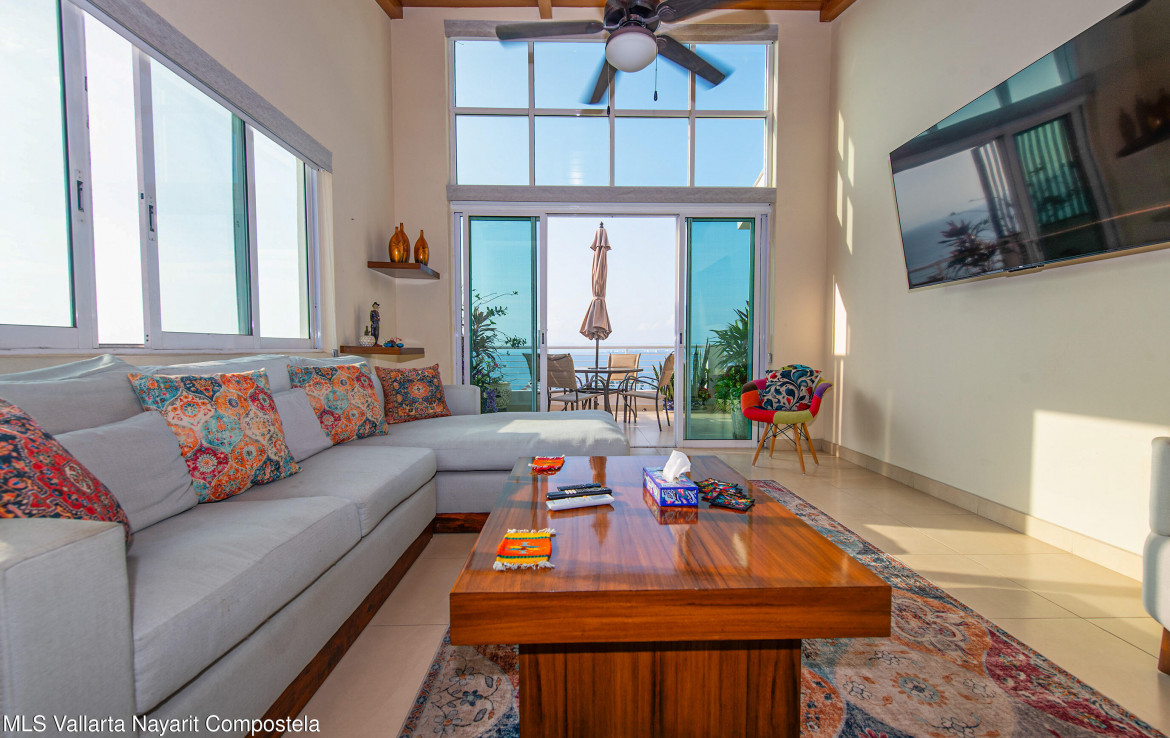 Ubicado en el ultimo piso del reconocido edificio Los Altos, este espacioso condominio de 2 recamaras y 2 banos ofrece una hermosa vista al mar y una combinacion ideal de comodidad, acabados de calidad y excelente iluminacion natural.La propiedad cuenta con 127 m de espacio interior bien distribuido, destacando los techos de doble altura en la sala y en la recamara principal, que aportan una sensacion de amplitud y realzan la experiencia de la vista al oceano. En todo el condominio, la madera de primavera en la cocina, closets y puertas anade calidez, estilo y durabilidad.
