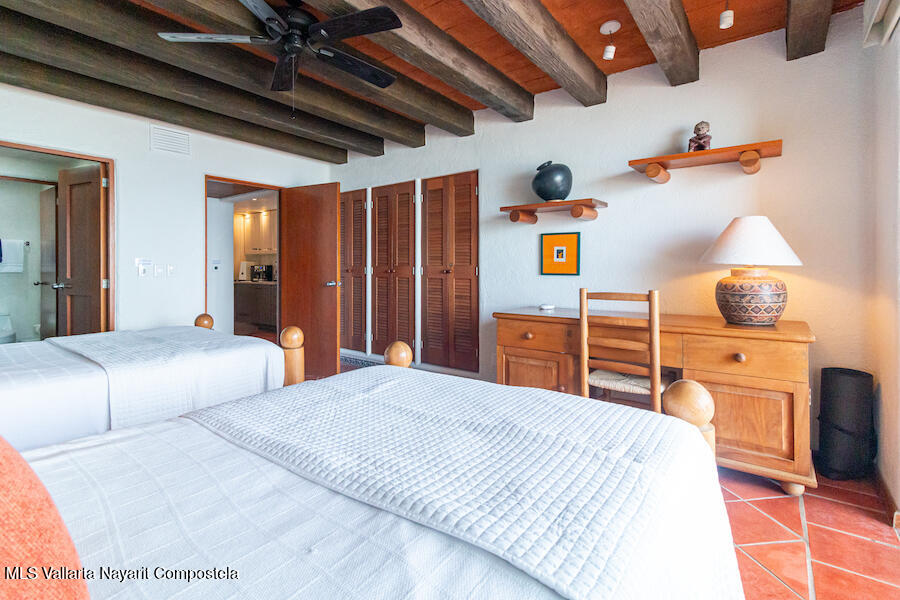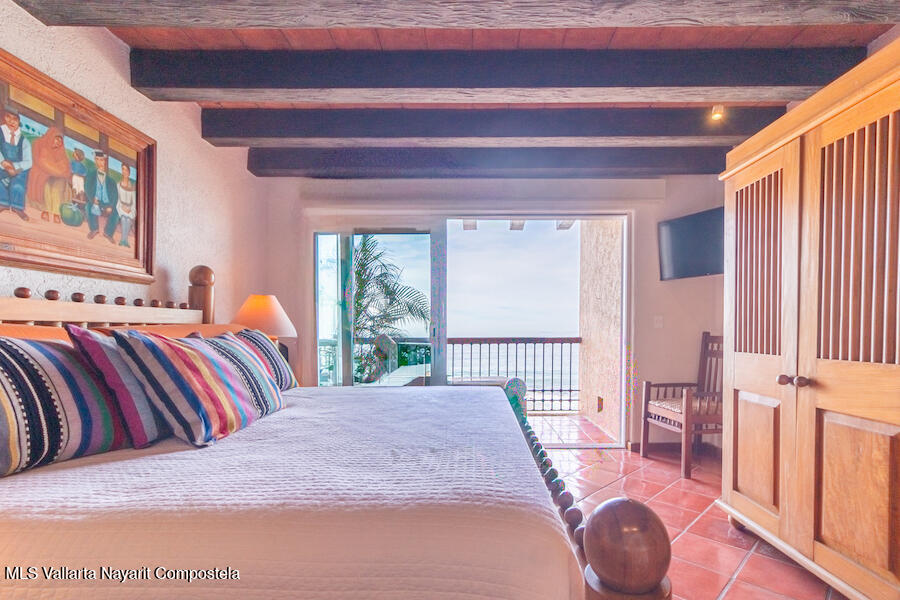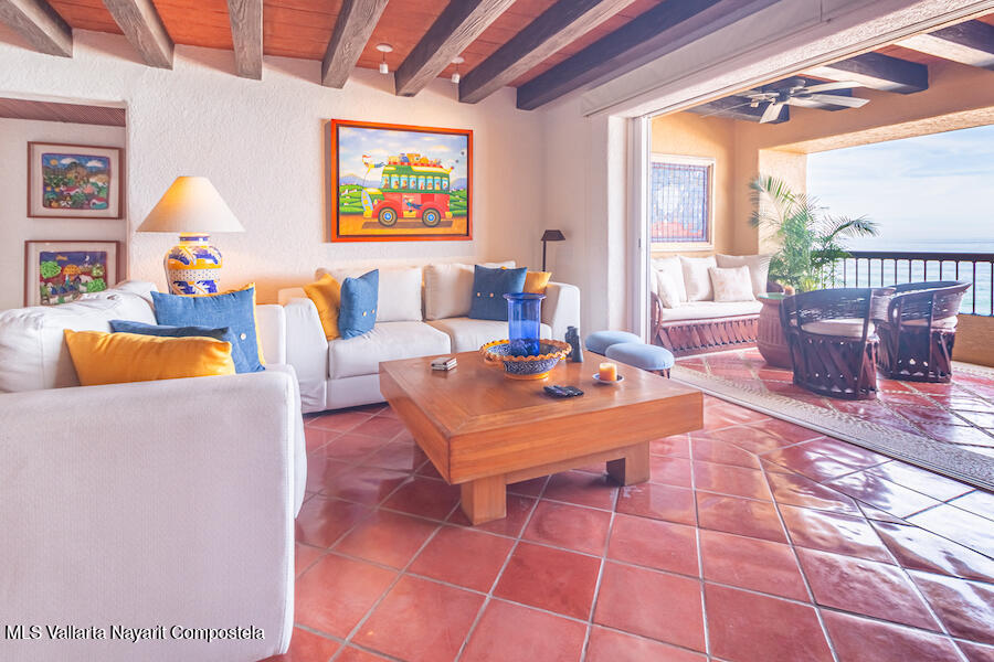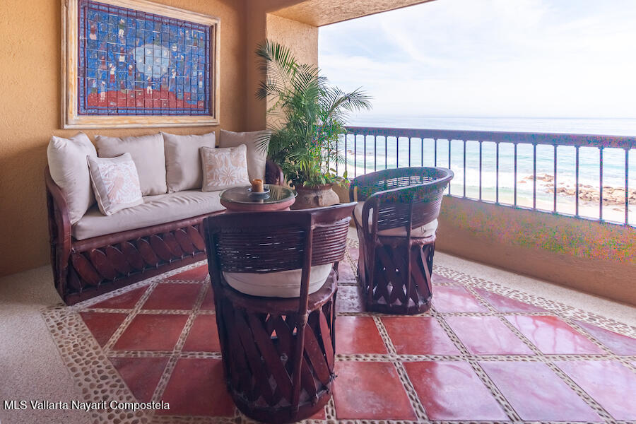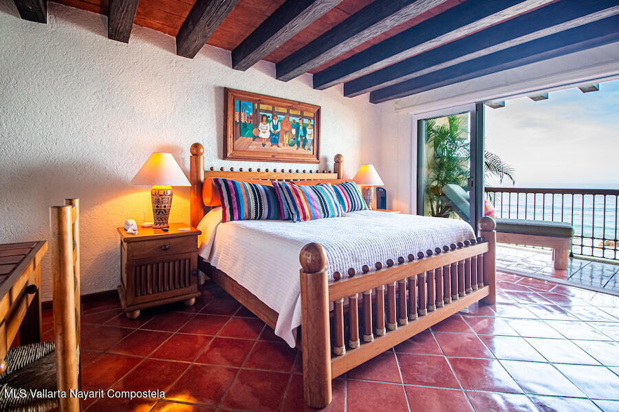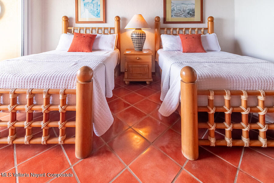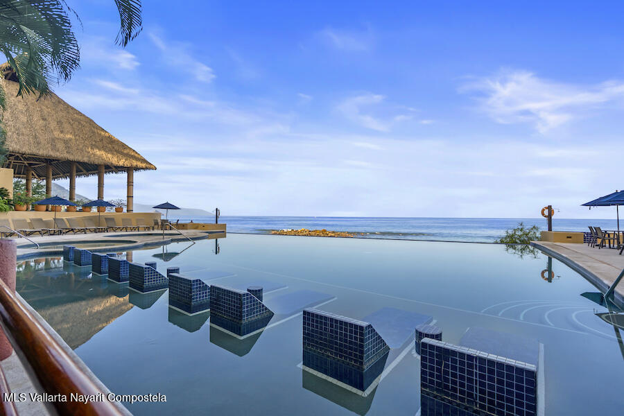 Residence 302 showcases timeless old-world Vallarta architecture with warm tones and quality finishes, including Saltillo tile flooring, solid tropical wood cabinetry, and exposed wooden beams that enhance its open-concept living spaces. The recently remodeled kitchen blends modern design with traditional Vallarta style, offering both functionality and harmony with the home’s original character. Both en-suite bedrooms feature private balconies with stunning views of the beach, Banderas Bay, Los Arcos, and the Sierra Madre Mountains. Common areas include a palapa Restaurant gym, lush gardens, and a large infinity pool, kids pool and a jacuzzi with access to the white sand beach.