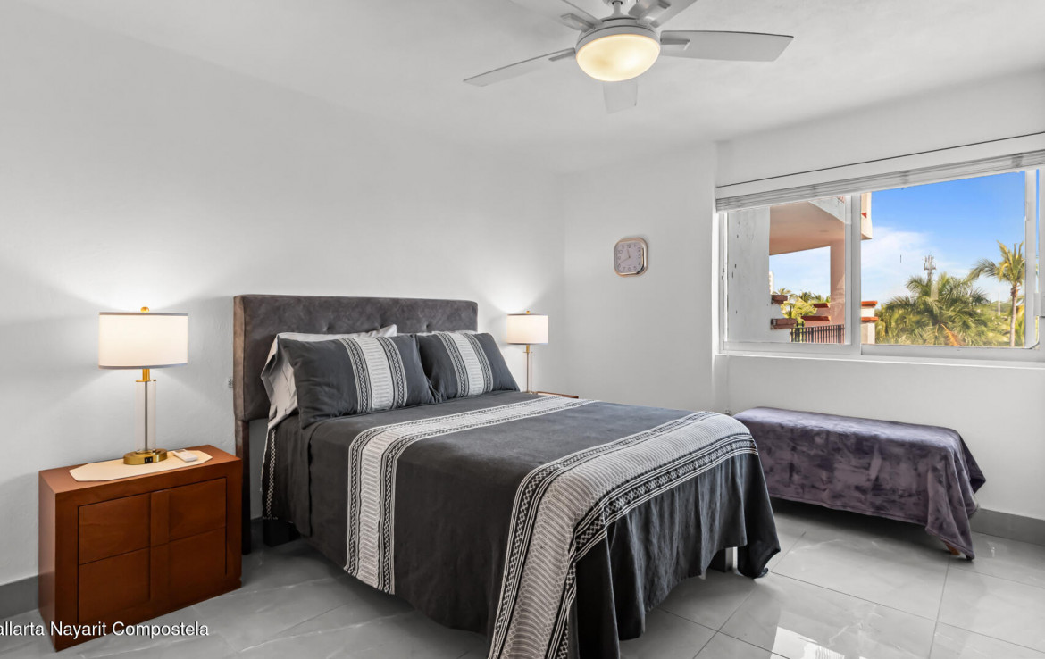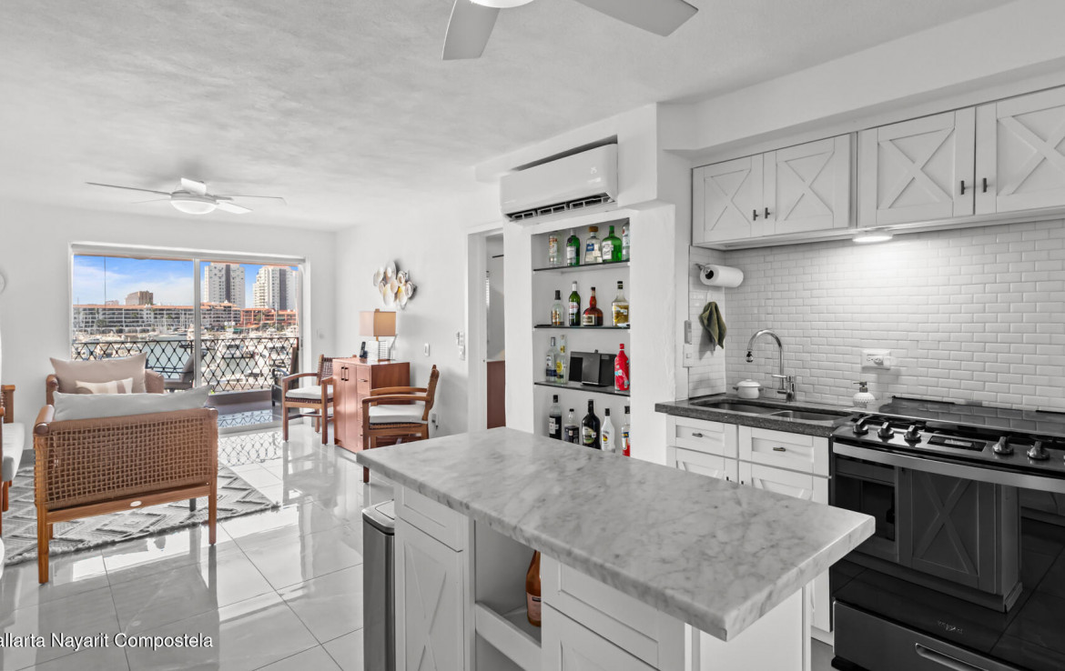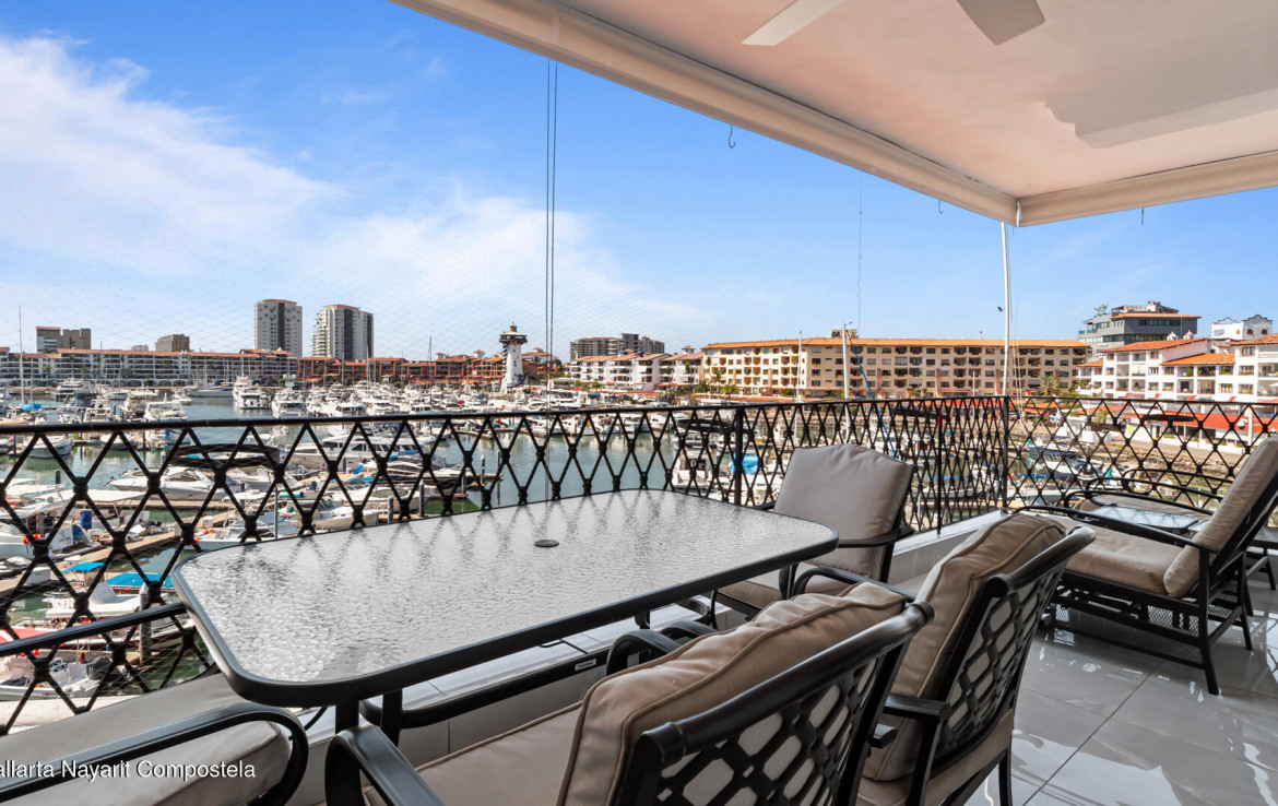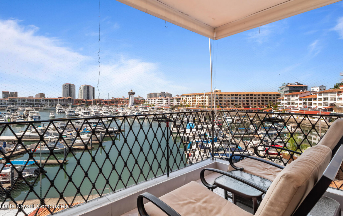 This elegantly remodeled fourth floor corner unit features a generous covered terrace with front-row views of the Marina, panoramas of yachts, water, and nightly sunsets included. Inside, a modern open kitchen with bar seating flows into the living area, where sliding doors frame the terrace and invite soft ocean breezes, perfect for everyday living or effortless entertaining. The serene primary suite also faces the marina and features a spotless bath with custom tile accents. Two additional bedrooms sit behind the living area with peaceful garden and mountain views and ample closets. The corner location allows for a gated entrance and additional terrace with mountain views.