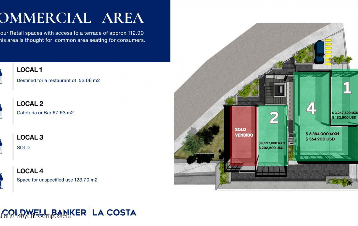 Unidad comercial en venta dentro de Mee-Tah Luxury Condos, Punta de Mita, Riviera Nayarit, ubicada en uno de los destinos de playa mas exclusivos y reconocidos de la region. Este espacio comercial es ideal para boutique, restaurante, spa, cafeteria o negocio orientado al turismo y estilo de vida premium. Forma parte de un desarrollo residencial de alta gama con roof deck, alberca, gimnasio y amenidades que favorecen un flujo constante de residentes y visitantes. Excelente oportunidad de inversion para establecer un negocio en una zona de alta demanda, prestigio y proyeccion de crecimiento.