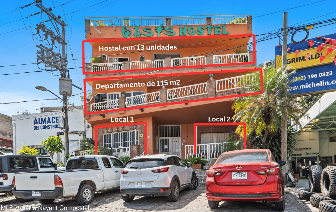 Propiedad ubicada sobre Av. Luis Donaldo Colosio, una de las avenidas con mayor conectividad y flujo vehicular en Vallarta, actualmente operando como hostel y generando multiples fuentes de ingreso; el edificio cuenta con 4 niveles: en planta baja 2 locales comerciales con frente a la avenida, en el primer nivel 2 departamentos independientes (uno de 3 recamaras, 2 banos y terraza con 115 m, y otro de 1 recamara y 1 bano con 86 m), en el tercer nivel un hostel con 13 unidades y el cuarto nivel una terraza con vista a la montana; ofrece 6 espacios de estacionamiento, uso de suelo mixto, y cuenta con doble acceso (avenida principal y calle trasera). Por su ubicacion y distribucion, es ideal para continuar como negocio de hospedaje, renta de departamentos o desarrollar un proyecto mixto.