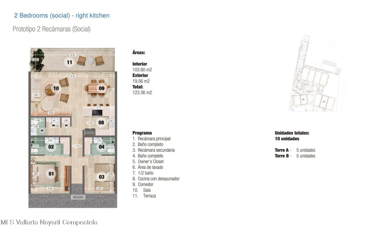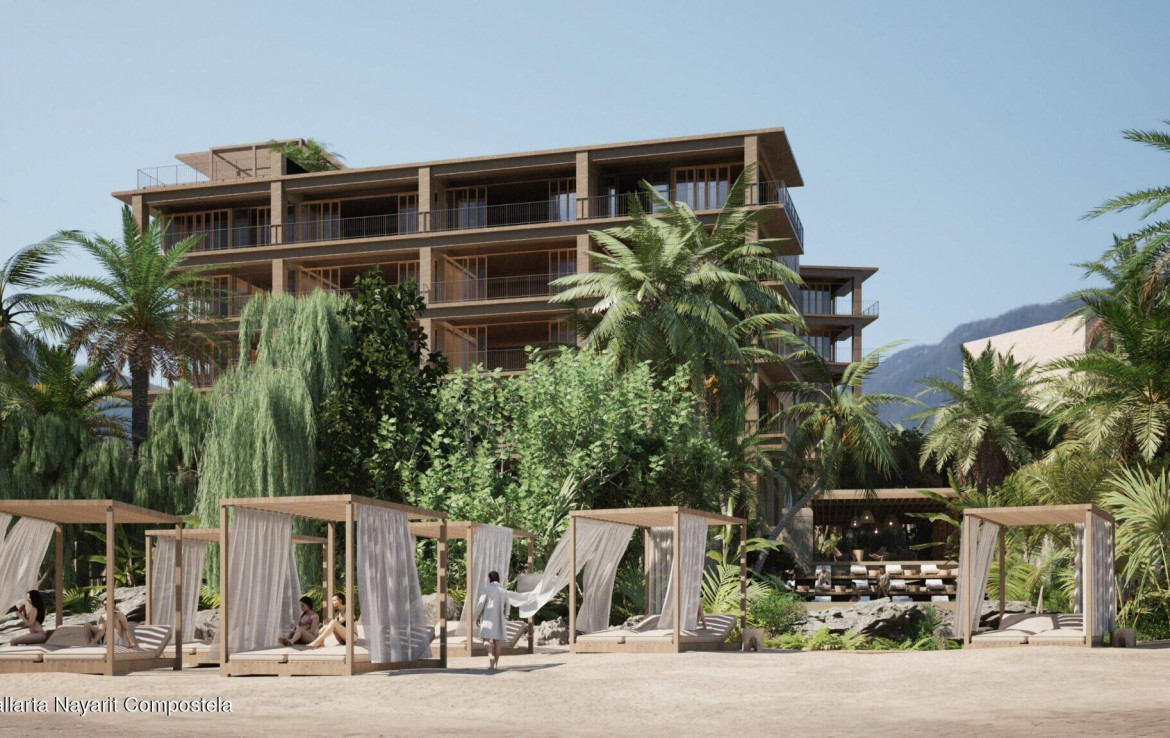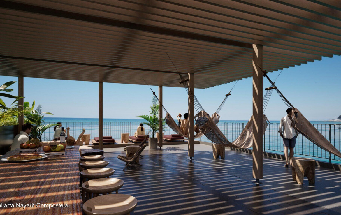 Olaya sits in the heart of Sayulita on the Riviera Nayarit. Located on the north side of town, this exclusive gated community is home to 45 beachfront units. Offered in a variety of unit types, the 2 Bedroom Social is a reflection of this amenity-rich development. With the kitchen located on the right upon entry, this open floor plan concept is the perfect environment to relax at home or entertain friends and family. Open spaces flow through the residence highlighting natural light and a classic boho beach design. The units are 123 square meters and boast an impressive amount of features inside and out. Each bedroom has its own ensuite and there is an additional half bath in the living area