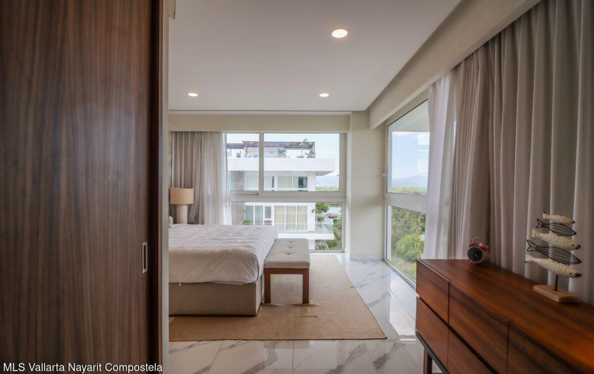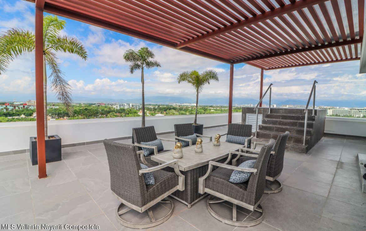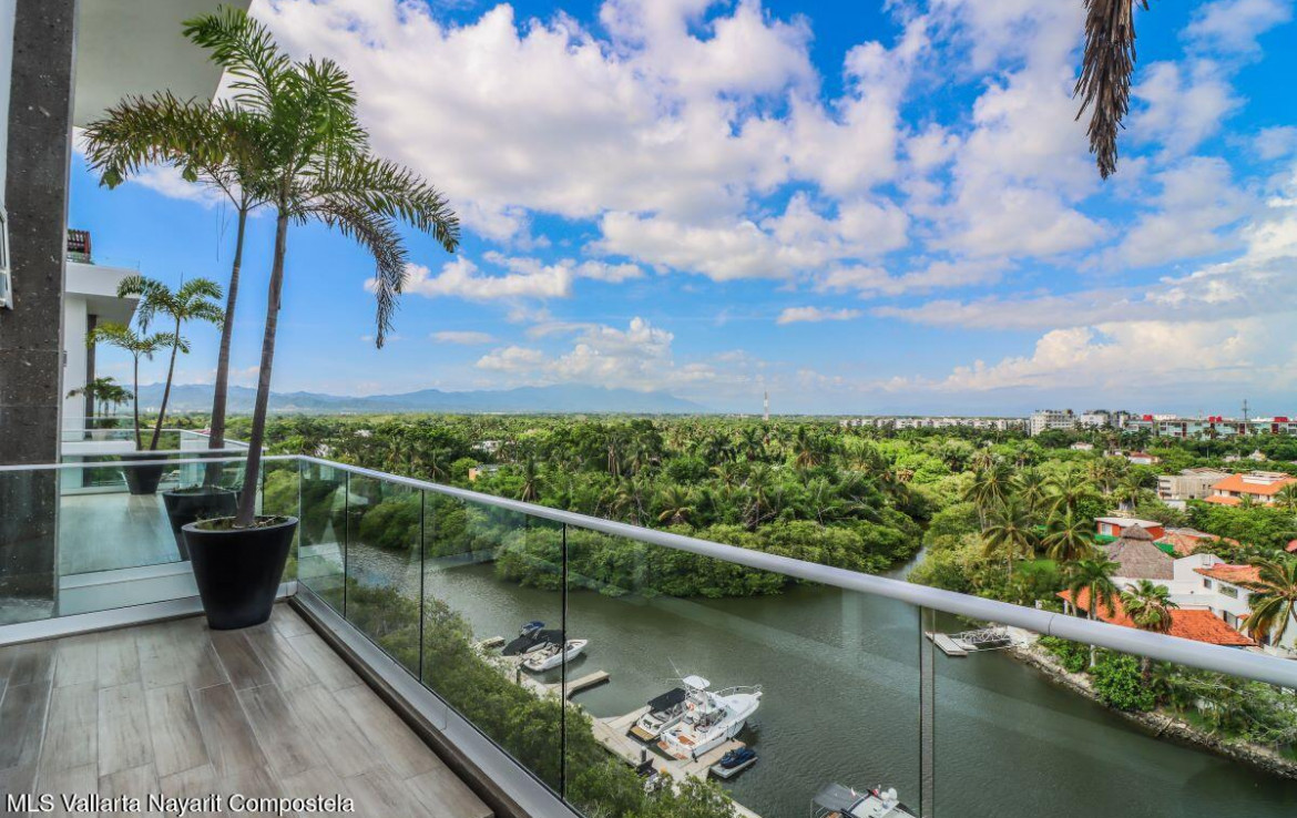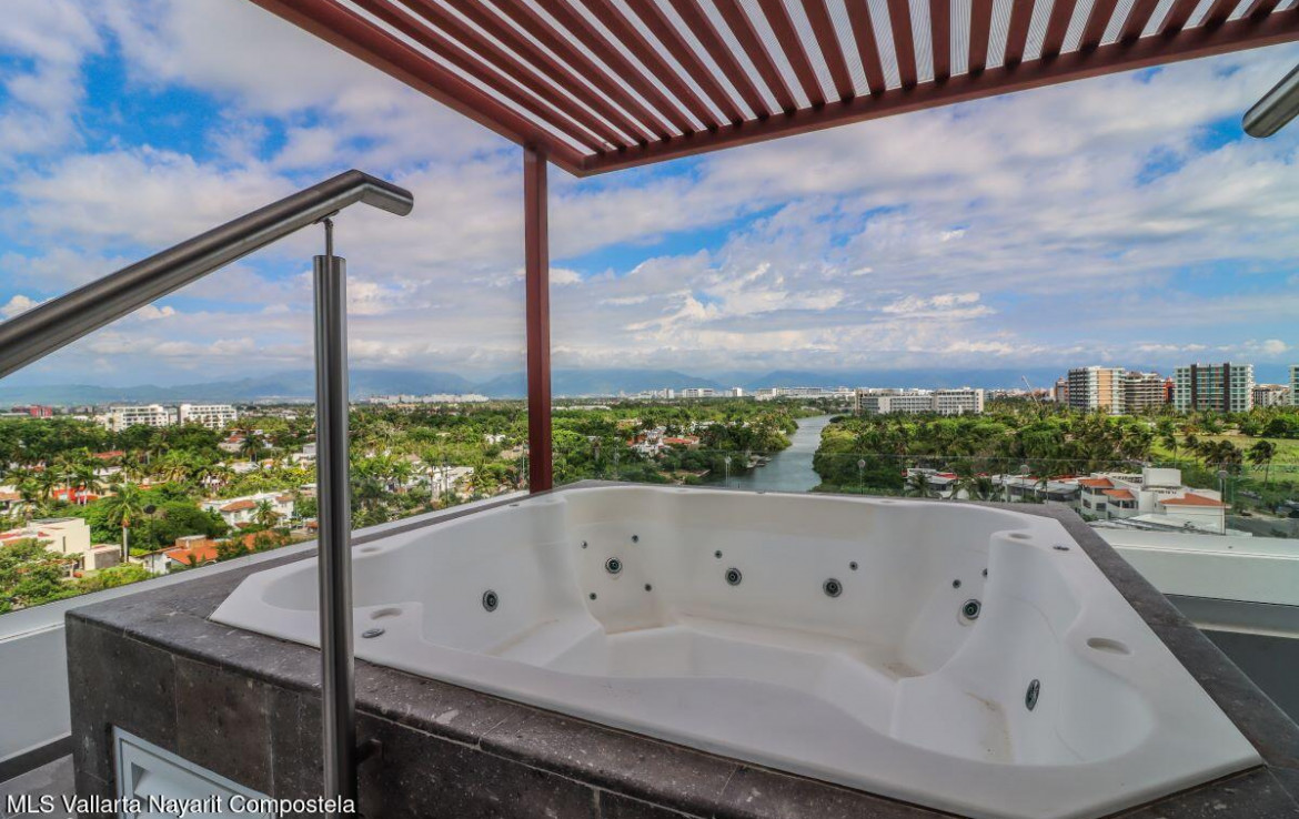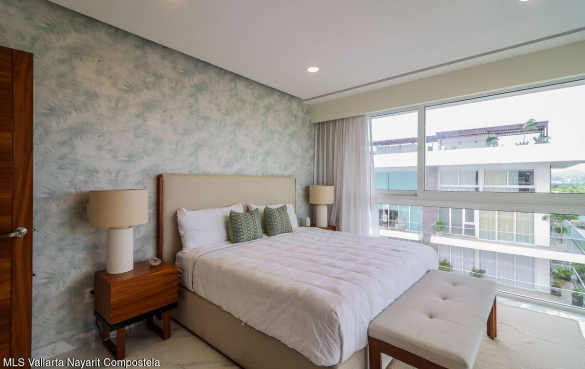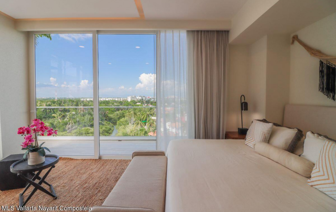 A residence where design, spaciousness, and surroundings blend in perfect harmony. This three-bedroom, five-bath penthouse offers a sophisticated lifestyle, with spaces focused on comfort and a direct connection to nature. Each bedroom is a bright sanctuary with large windows and private terraces overlooking the canal and pool. The fully equipped kitchen and living room feature double-height windows with electric blinds that elegantly control natural light. The main terrace includes dining area, and jacuzzi, perfect for enjoying uninterrupted views of the canal, villas, mountains, and distant sea. Located in Quinta San Miguel Ocean & Canal, the community offers a pool, gym, rooftop, and canal for water activities. Designed for those seeking the exceptional in Nuevo Vallarta.