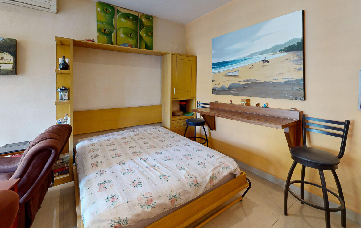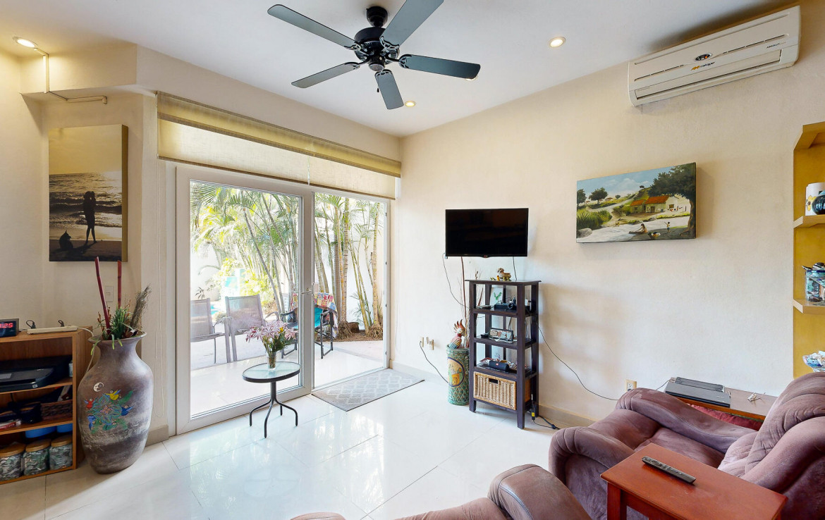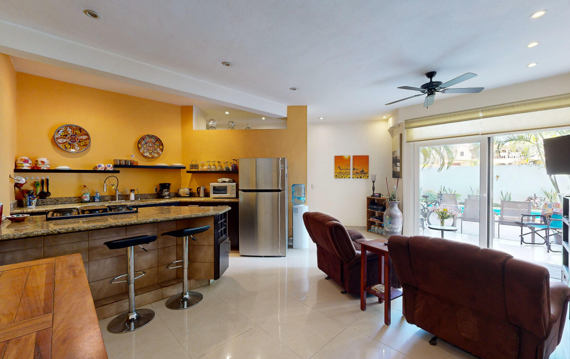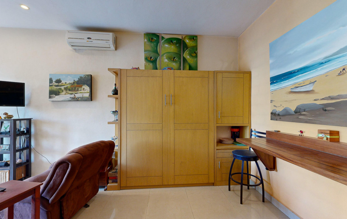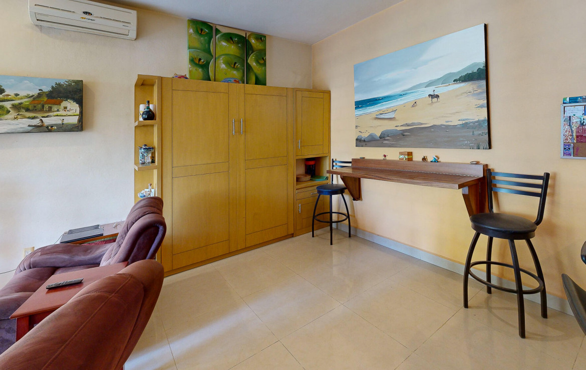 Experience the best value in the area, with unbeatable price per meter, just steps from the beach. This luxurious condo offers a serene retreat featuring a spacious bedroom, a cozy TV area, and a versatile living room with a stunning solid wood Murphy bed, perfect for accommodating extra guests. The open-concept living-dining space flows effortlessly onto a large terrace through pocket glass doors, blending indoor and outdoor living, with direct access to the inviting pool. The modern kitchen is a dream for culinary enthusiasts, boasting a large breakfast bar, ample storage, granite countertops, and high-end appliances, including a gas range and dishwasher. This move-in-ready condo has been meticulously designed for your ultimate comfort and enjoyment.