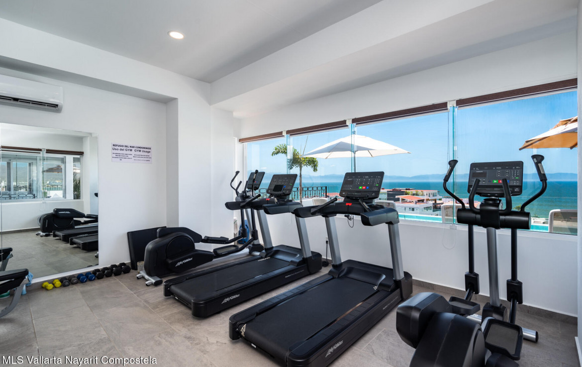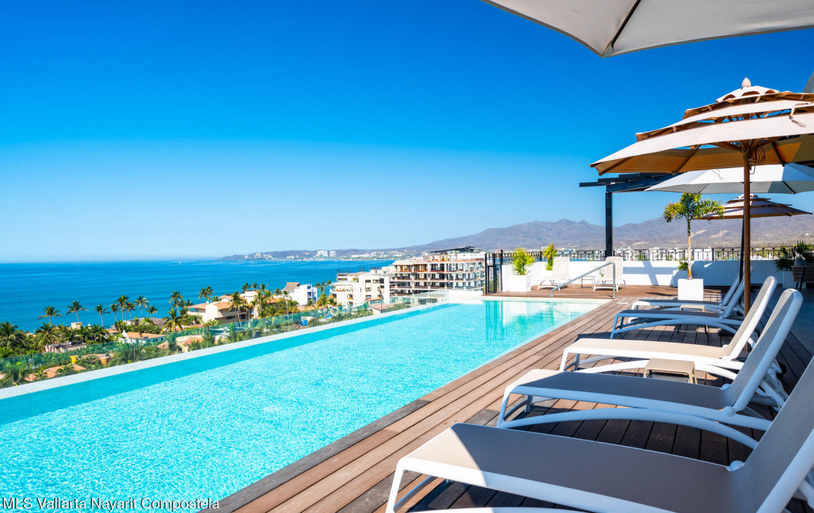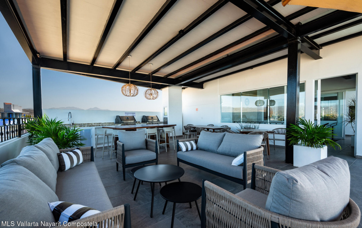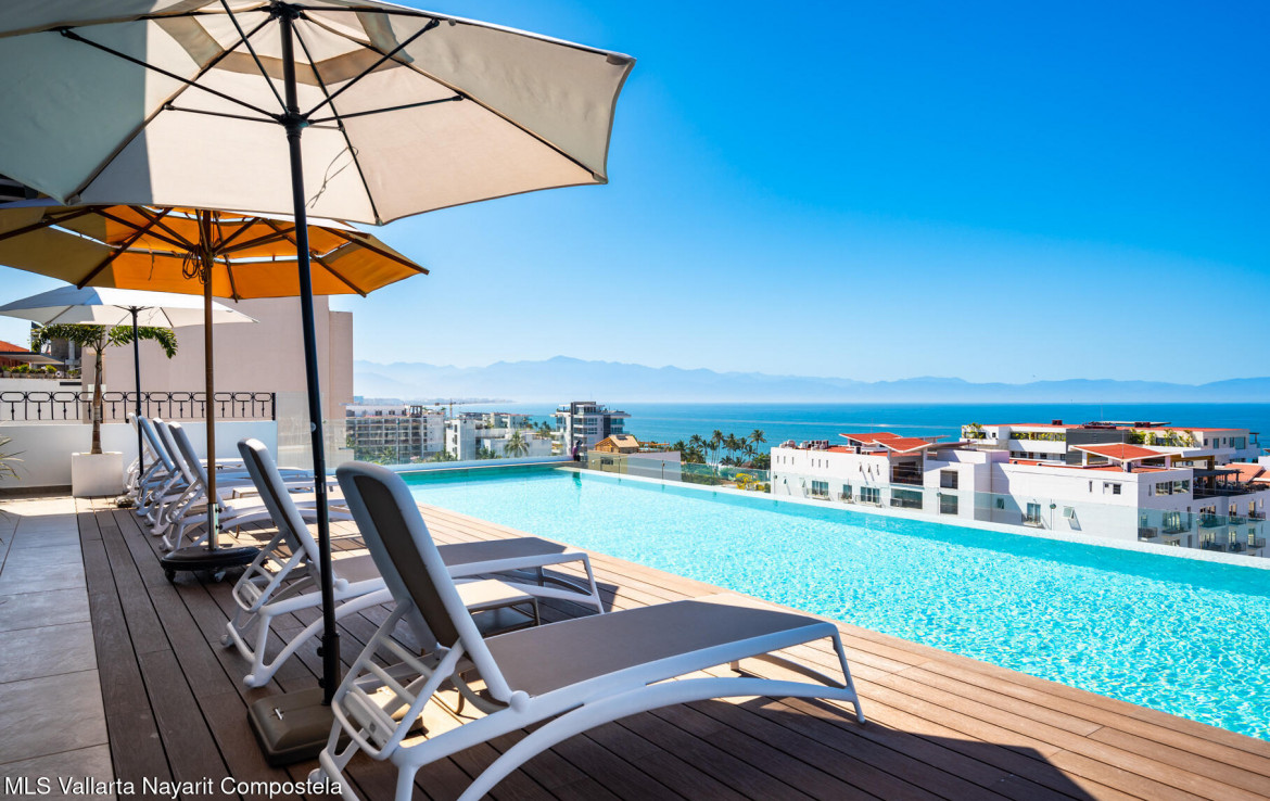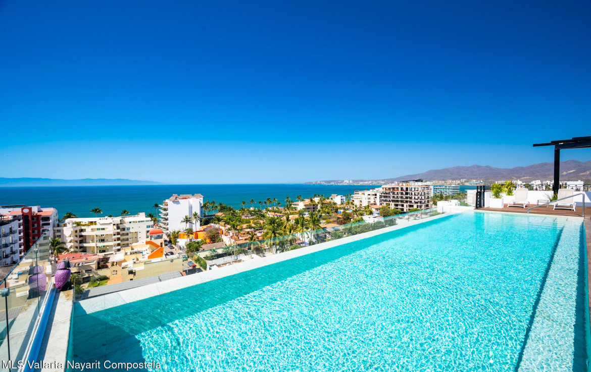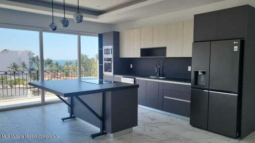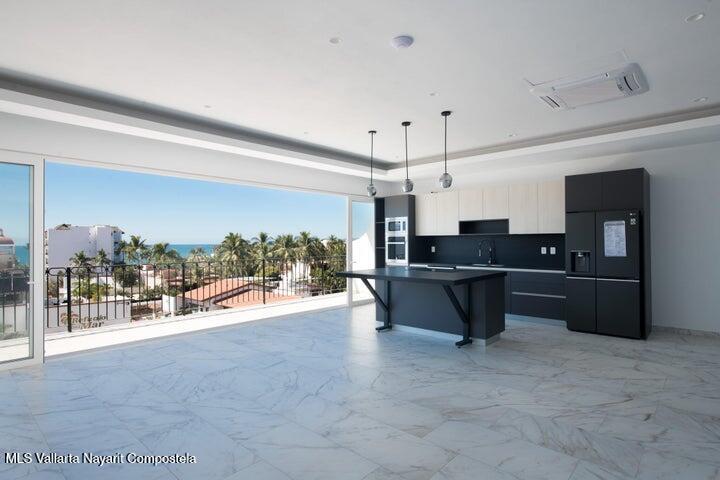 Beautiful New building, ready to move in, located in the Zona Dorada of picturesque Bucerias, only 2 blocks from the beautiful swimmable beach and walking distance to many restaurants, shopping and art galleries. This unit is very spacious featuring Italian kitchens and includes refrigerator, dishwasher, cooktop, oven and microwave. An underground parking and storage locker are also included. Roof top amenities have spectacular views to the ocean and the whole bay, enjoy the Infinity salt water heated pool, Gym and BBQ area. Official prices are in dollars.