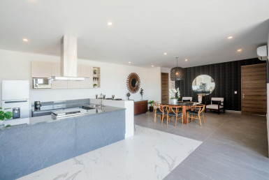 Experience bright, tropical living just across from the beach! This beautifully updated, fully furnished 3-bed, 3-bath penthouse in the boutique Santa Fe complex at Flamingos blends coastal elegance with a relaxed resort feel. The light-filled open-concept living & dining area features fresh, modern furnishings & flows seamlessly onto a spacious terrace overlooking a lush green area & golf course development and mountains. Two airy bedrooms with en-suite baths are on the main level, while the upper-level master suite offers a cozy, private terrace and luxurious jacuzzi bath & shower–the perfect tropical retreat. Enjoy amenities including a sparkling pool, two parking spaces, & easy access to miles of scenic biking & walking trails & private access to beach.