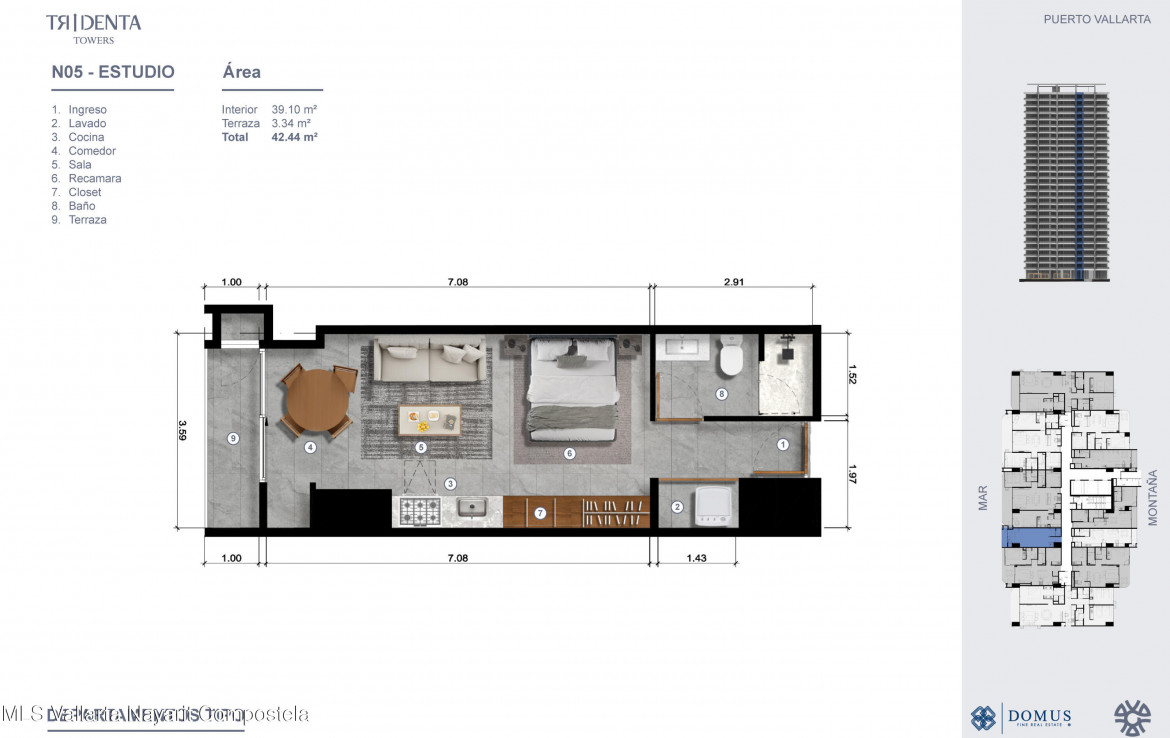 Tridenta Towers presenta un estilo de vida de playa en la Zona Hotelera de Puerto Vallarta. Esta obra maestra arquitectonica ofrece 335 exquisitas residencias en la Torre 1, desde estudios hasta departamentos de 3 habitaciones, cada uno con impresionantes vistas al mar o a las montanas. Disfruta de amenidades que incluyen albercas infinity, una increible terraza superior con vistas panoramicas a la bahia, un beach club, canchas de padel, gimnasio y exuberantes jardines tropicales. Su ubicacion privilegiada combina la tranquilidad de vivir frente al mar con facil acceso a restaurantes y vida nocturna. Estacionamiento disponible con costo adicional.