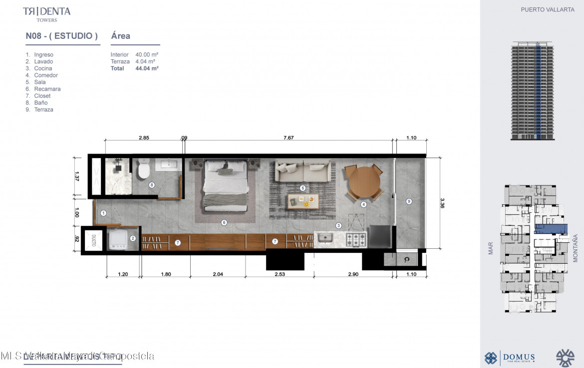Disenado por los aclamados arquitectos de GVA, Tridenta Towers presenta un estilo de vida de playa en la Zona Hotelera de Puerto Vallarta. Esta obra maestra arquitectonica ofrece 312 exquisitas residencias en la Torre 1, desde estudios hasta departamentos de 3 habitaciones, cada uno con impresionantes vistas al mar o a las montanas. Disfruta de amenidades que incluyen albercas infinity, una increible terraza superior con vistas panoramicas a la bahia, un beach club, canchas de padel, gimnasio y exuberantes jardines tropicales. Su ubicacion privilegiada combina la tranquilidad de vivir frente al mar con facil acceso a restaurantes y vida nocturna. Estacionamiento disponible con costo adicional.