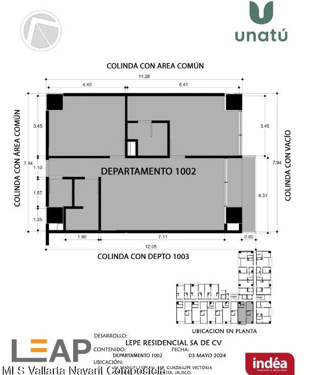 Ubicado en Calle Manuel Lepe, Col. Guadalupe Victoria, una de las zonas con mayor crecimiento y plusvalia en Puerto Vallarta, UNATU ofrece alta conectividad al aeropuerto, central camionera, centros comerciales y playas. Desarrollado por INDEA, cuenta con 116 departamentos en 10 niveles + rooftop, amenidades premium, estacionamiento y bodegas. Entrega estimada abril 2028. Mantenimiento aprox. $45 MXN/m.