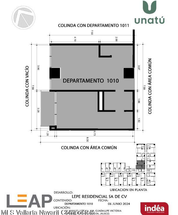 Ubicado en Calle Manuel Lepe, Col. Guadalupe Victoria, una de las zonas con mayor crecimiento y plusvalia en Puerto Vallarta, UNATU ofrece alta conectividad al aeropuerto, central camionera, centros comerciales y playas. Desarrollado por INDEA, cuenta con 116 departamentos en 10 niveles + rooftop, amenidades premium, estacionamiento y bodegas. Entrega estimada abril 2028. Mantenimiento aprox. $45 MXN/m.