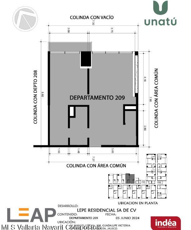 Ubicado en Calle Manuel Lepe, Col. Guadalupe Victoria, una de las zonas con mayor crecimiento y plusvalia en Puerto Vallarta, UNATU ofrece alta conectividad al aeropuerto, central camionera, centros comerciales y playas. Desarrollado por INDEA, cuenta con 116 departamentos en 10 niveles + rooftop, amenidades premium, estacionamiento y bodegas. Entrega estimada abril 2028. Mantenimiento aprox.