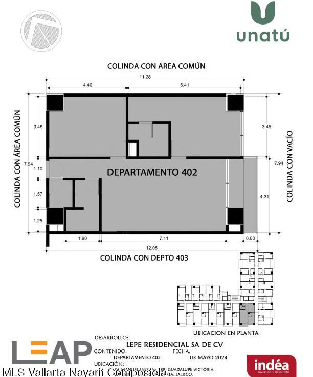 Ubicado en Calle Manuel Lepe, Col. Guadalupe Victoria, una de las zonas con mayor crecimiento y plusvalia en Puerto Vallarta, UNATU ofrece alta conectividad al aeropuerto, central camionera, centros comerciales y playas. Desarrollado por INDEA, cuenta con 116 departamentos en 10 niveles + rooftop, amenidades premium, estacionamiento y bodegas. Entrega estimada abril 2028.