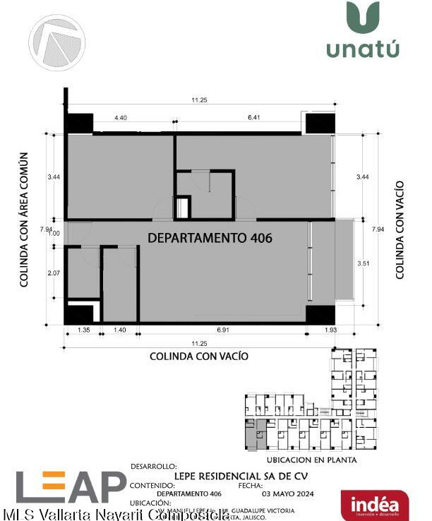 Ubicado en Calle Manuel Lepe, Col. Guadalupe Victoria, una de las zonas con mayor crecimiento y plusvalia en Puerto Vallarta, UNATU ofrece alta conectividad al aeropuerto, central camionera, centros comerciales y playas. Desarrollado por INDEA, cuenta con 116 departamentos en 10 niveles + rooftop, amenidades premium, estacionamiento y bodegas. Entrega estimada abril 2028.