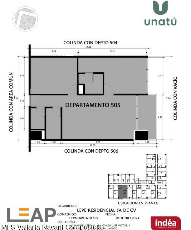 Ubicado en Calle Manuel Lepe, Col. Guadalupe Victoria, una de las zonas con mayor crecimiento y plusvalia en Puerto Vallarta, UNATU ofrece alta conectividad al aeropuerto, central camionera, centros comerciales y playas. Desarrollado por INDEA, cuenta con 116 departamentos en 10 niveles + rooftop, amenidades premium, estacionamiento y bodegas. Entrega estimada abril 2028.