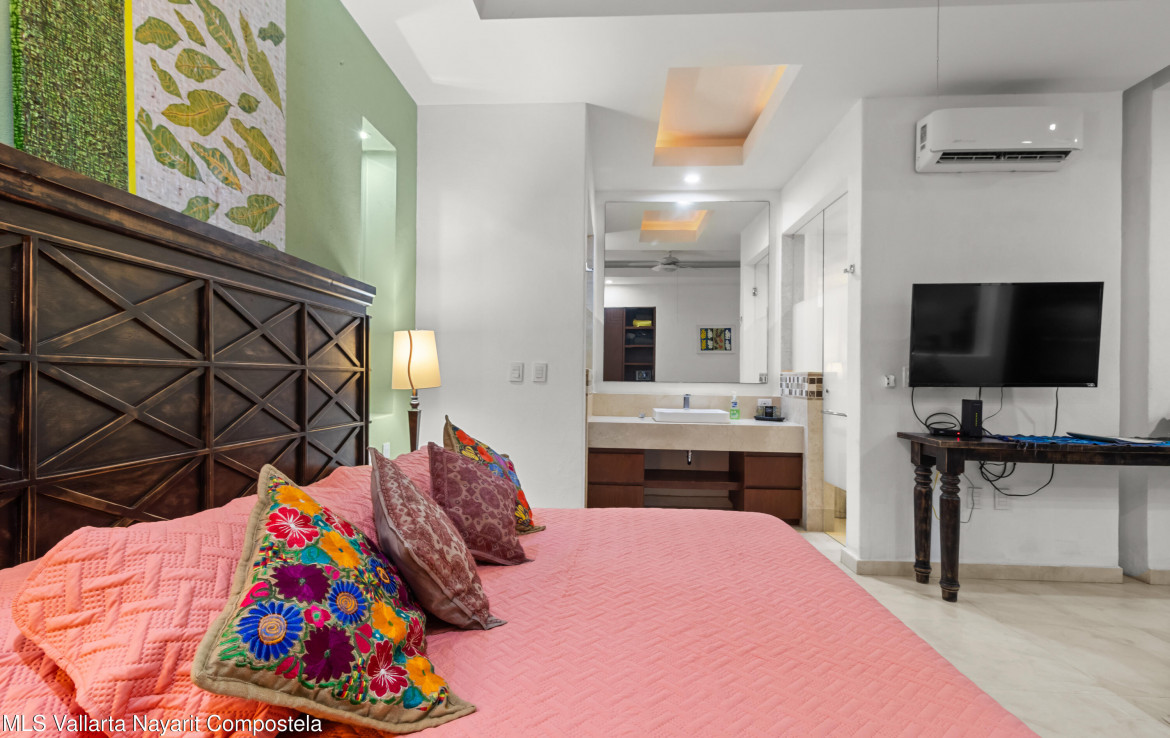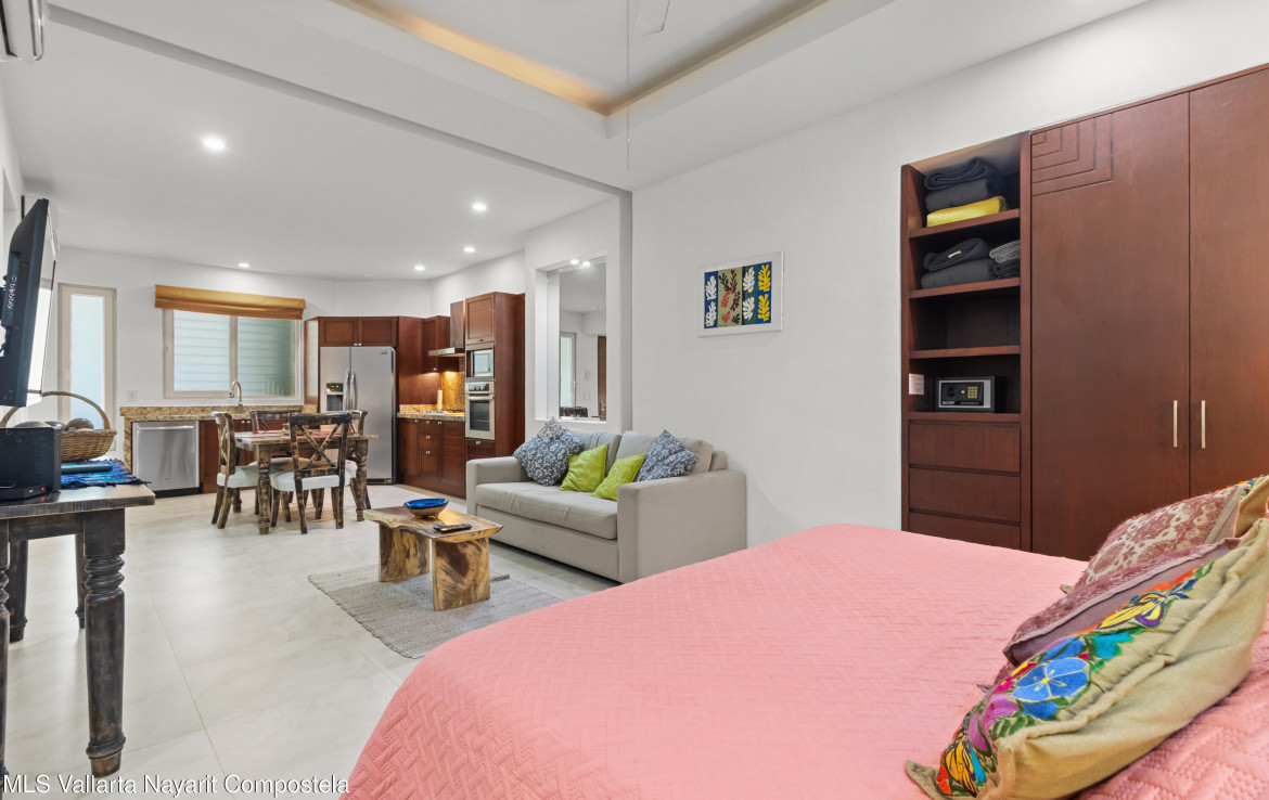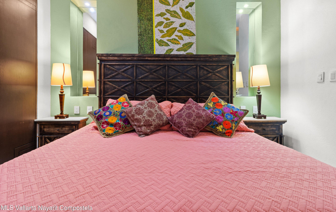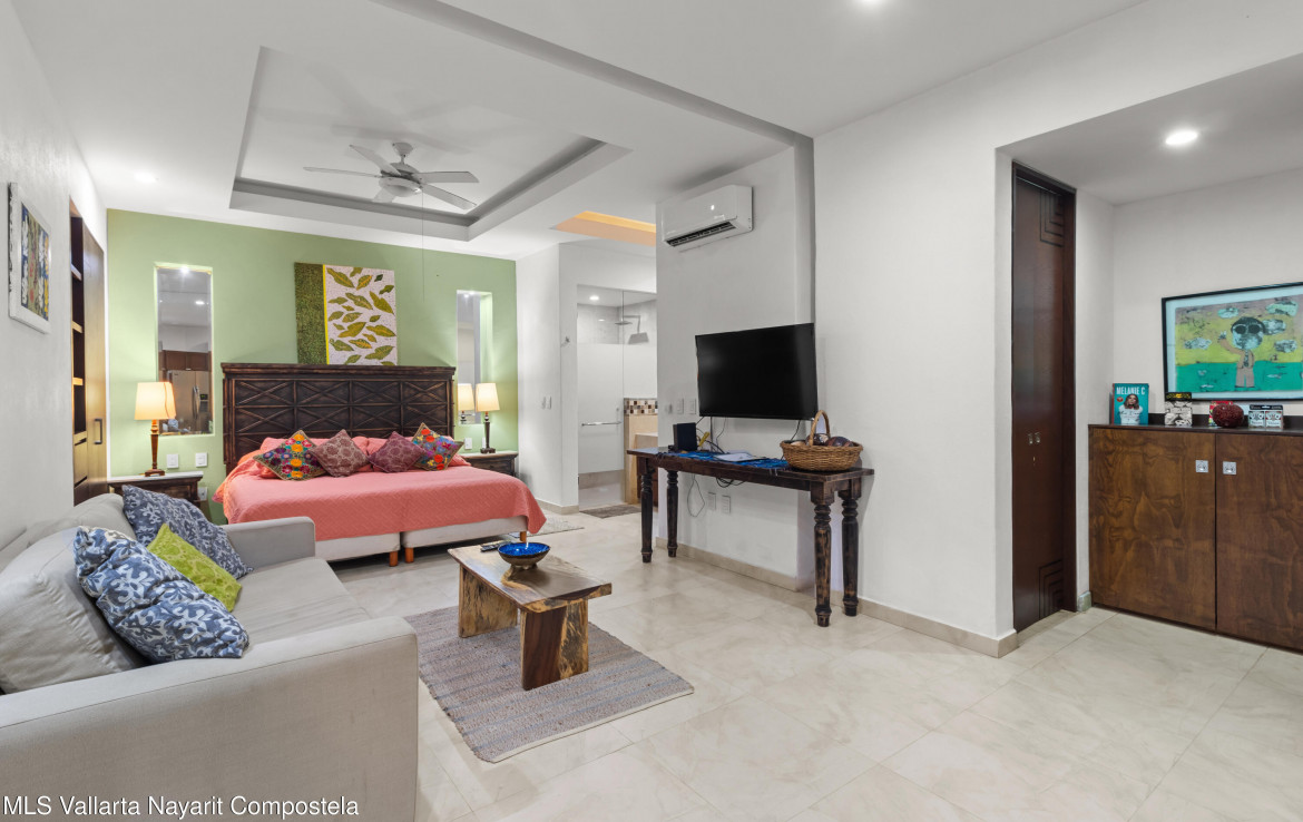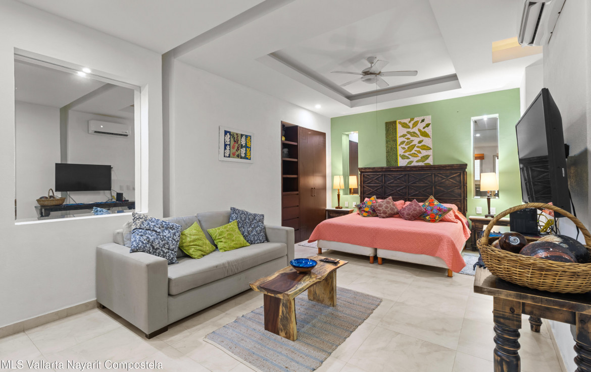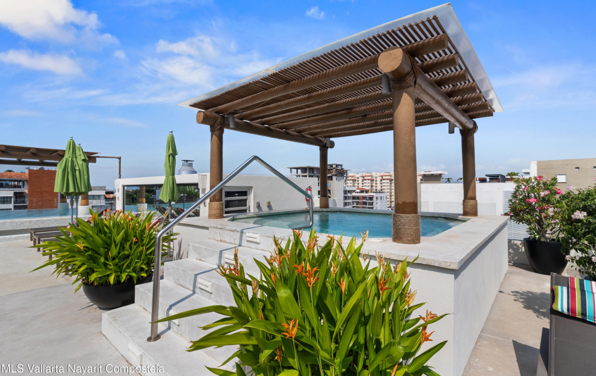 This sophisticated condo offers a perfect blend of comfort and privacy. Located on the 3rd-floor. The rooftop terrace boasts a heated infinity pool, Jacuzzi, BBQ grill, bar, and areas for dining and lounging, all with stunning 360-degree views of the Bay of Banderas, Sierra Madre Mountains, and Puerto Vallarta’s city lights. The remodeled one-bedroom, one-bath unit features a king-size bed, high-speed Wi-Fi, smart TV, air conditioning, a fully equipped kitchen, full-sized washer and dryer, and private parking and storage.