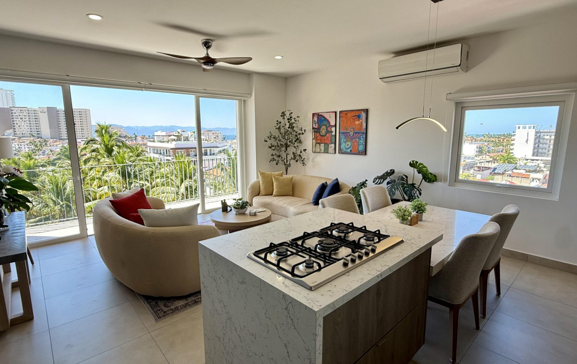 Amazing views from every window in this 2 bedroom and 2 full bath condo. The oversized covered terrace and every room has panoramic views of Puerto Vallarta, town, mountains and ocean. Designer furnishings and custom kitchen with upgraded countertops and cabinets. Rooftop pool, gym and fire pit give you the resort living needed to enjoy your days and nights. Located in the lower Versalles area you can walk to the Malecon, Hotel Zone or all of the shops and restaurants in Versalles. No hills !!!!! Unit includes parking in the garage.